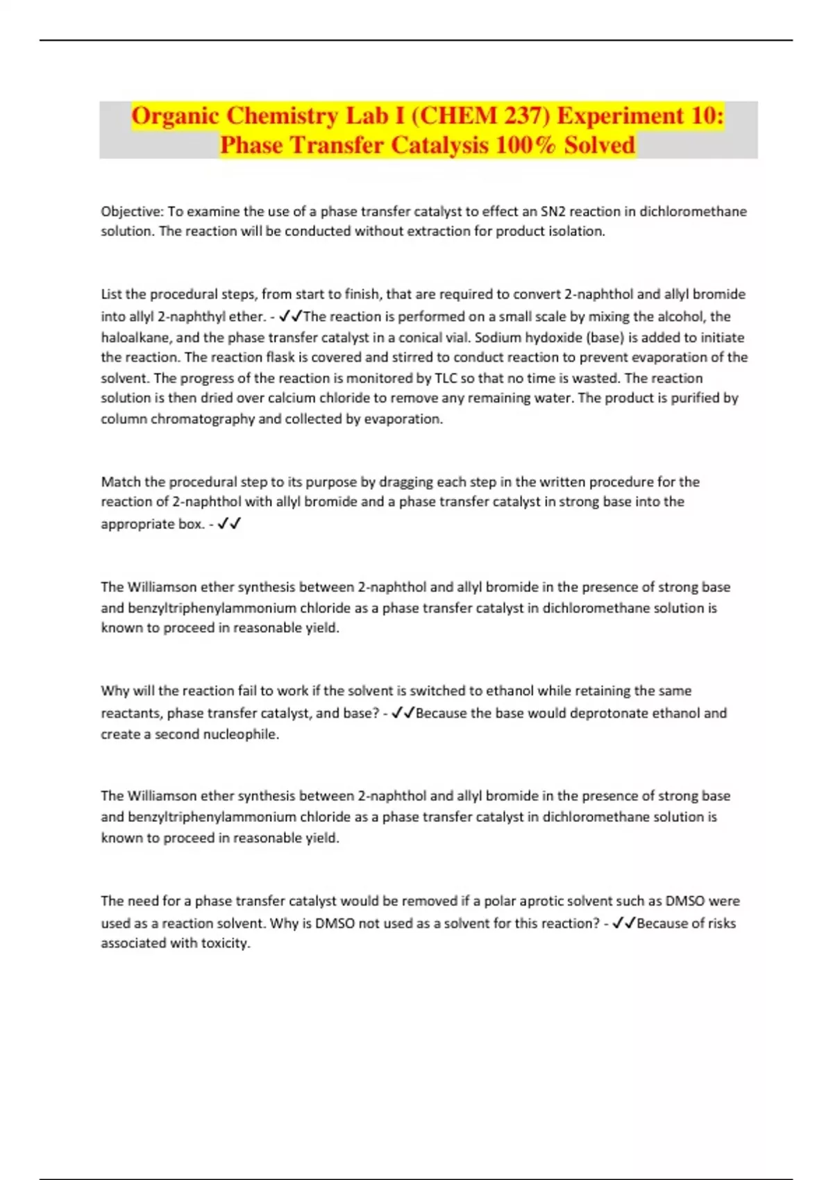 Organic Chemistry Lab I (CHEM 237) Experiment 10: Phase Transfer Catalysis 100% Solved