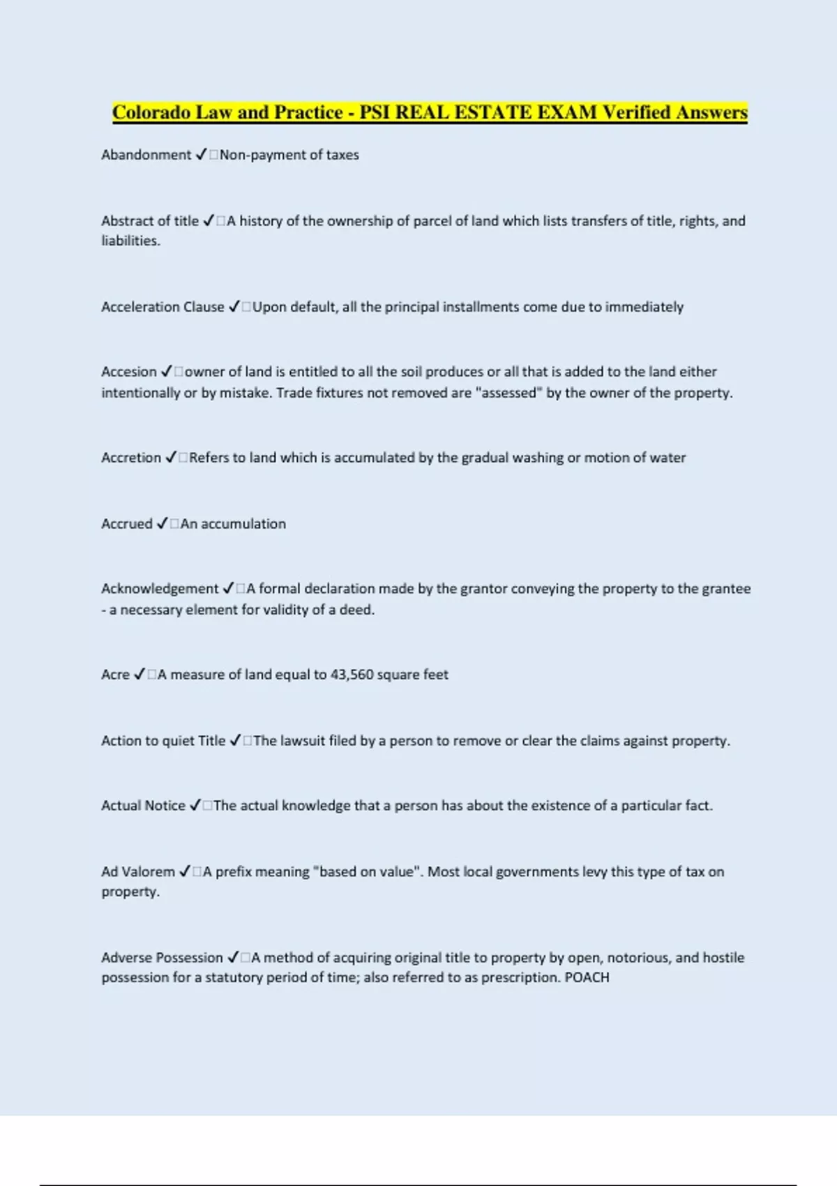 Colorado Law and Practice - PSI REAL ESTATE EXAM Verified Answers Abandonment ️Non-payment of taxes Abstract of title ️A history of the ownership of parcel of land which lists transfers of title, rights, and liabilities. Acceleration Clause ️Upon default, all the principal installments come due to immediately Accesion ️owner of land is entitled to all the soil produces or all that is added to the land either intentionally or by mistake. Trade fixtures not removed are "assessed" by the owner of the property. Accretion ️Refers to land which is accumulated by the gradual washing or motion of water Accrued ️An accumulation Acknowledgement ️A formal declaration made by the grantor conveying the property to the grantee - a necessary element for validity of a deed. Acre ️A measure of land equal to 43,560 square feet Action to quiet Title ️The lawsuit filed by a person to remove or clear the claims against property. Actual Notice ️The actual knowledge that a person has about the existence of a particular fact. Ad Valorem ️A prefix meaning "based on value". Most local governments levy this type of tax on property. Adverse Possession ️A method of acquiring original title to property by open, notorious, and hostile possession for a statutory period of time; also referred to as prescription. POACH Agency ️A relationship in which one party (the principle) authorizes another party (the agent) the act as the principle's representative in dealing with third parties Agent ️One who acts for and in place of a principle for the purpose of affecting the principle's legal relations with third persons. Air rights ️The eight to use, control and occupy the space above a particular parcel of land Alienation Clause ️A provision in a mortgage requiring full payment of the debt upon the transfer of the title to the property, due on sale. Prevents loan assumptions. Allodial ️The free and full ownership of rights in land by individuals, which is the basis of real property in the united states Amortization ️The repayment of a financial obligation over a period of time in a series of periodic installments. In a level-payment mortgage, this is the portion of the debt service that reduces the principle. Amortized Loan ️A financial debt that is paid off over a period of time by a series of periodic payments. A loan can be fully amortized of partially amortized requiring a balloon payment to satisfy the debt at the end of the term. Annual Percentage Rate (APR) ️The yearly cost of credit. interest rate plus finance charge. Appraisal ️An opinion or estimate of value performed by a person licensed to do so. Appreciation ️An increase in Value Appurtenance ️Any right of privilege which belongs to and passes with land. Arms-Length Transaction ️Transaction which occurs between willing buyer and willing seller with each party completely knowledgeable about the market. Not a purchase of a property between relatives (father & Son) Arrears ️Not on time; Late in making payments or completing work. Interest can be paid like this. As is ️A phrase which disclaims any promises or warranties. A person purchasing real estate in this form, takes it in exactly the condition in which it is found. Seller cannot hide latent defects. Assembledge ️Bringing two or more lots together under one ownership. Assessed Value ️The value placed on property, by tax assessor, for the purpose of determining t