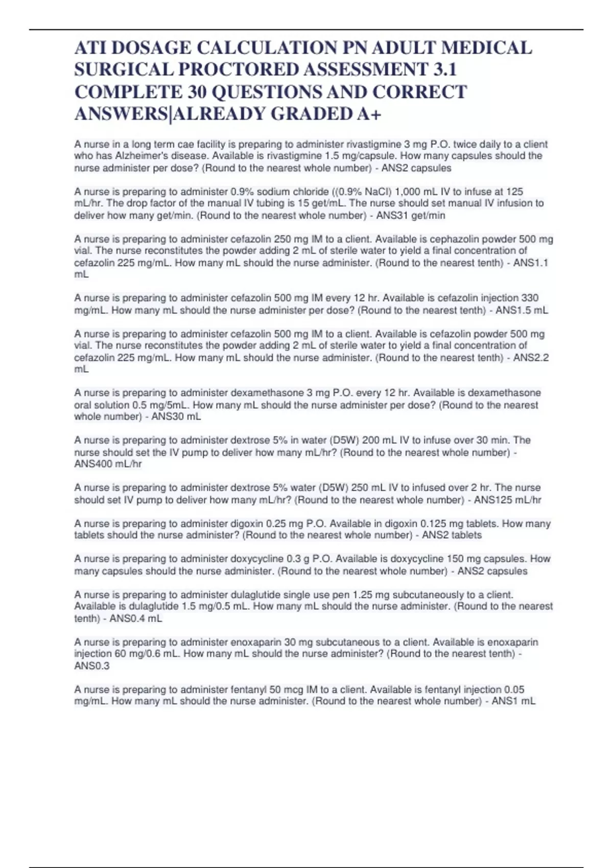 ATI DOSAGE CALCULATION PN ADULT MEDICAL SURGICAL PROCTORED ASSESSMENT 3.1 COMPLETE 30 QUESTIONS AND CORRECT ANSWERS|ALREADY GRADED A+