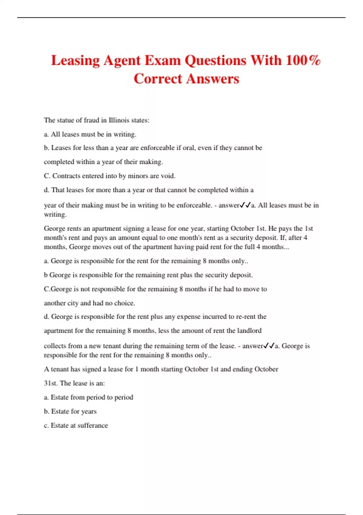 Leasing Agent Exam Questions With 100% Correct Answers The statue of fraud in Illinois states: a. All leases must be in writing. b. Leases for less than a year are enforceable if oral, even if they cannot be completed within a year of their making. C. Contracts entered into by minors are void. d. That leases for more than a year or that cannot be completed within a year of their making must be in writing to be enforceable. - answera. All leases must be in writing. George rents an apartment signing a lease for one year, starting October 1st. He pays the 1st month's rent and pays an amount equal to one month's rent as a security deposit. If, after 4 months, George moves out of the apartment having paid rent for the full 4 months... a. George is responsible for the rent for the remaining 8 months only.. b George is responsible for the remaining rent plus the security deposit. C.George is not responsible for the remaining 8 months if he had to move to another city and had no choice. d. George is responsible for the rent plus any expense incurred to re-rent the apartment for the remaining 8 months, less the amount of rent the landlord collects from a new tenant during the remaining term of the lease. - answera. George is responsible for the rent for the remaining 8 months only.. A tenant has signed a lease for 1 month starting October 1st and ending October 31st. The lease is an: a. Estate from period to period b. Estate for years c. Estate at sufferance d. Estate at will - answerb. Estate for years Under the Illinois Law of Agency... a. Only the lessee can be your principal. b. Only the lessor can be your principal. 30 85 c. You can represent either the lessee or the lessor. d. You can represent both the lessor and the lessee provided that you make proper disclosure and obtain written consent from each. - answerd. You can represent both the lessor and the lessee provided that you make proper disclosure and obtain written consent from each. Any personal property being rented with the lease should be mentioned in the lease. These items would include: a. The water heater b. The furnace c. The stove and the refrigerator d. The light fixtures - answerd. The light fixtures The majority of residential leases are: a. Gross leases b. Net leases c. Triple net leases d. Percentage leases - answerb. Net leases It is unlawful to provide in a residential lease: a. That pets are not allowed on the premises b. That smoking is not allowed within the leased premises c. That service animals are prohibited upon the premises, whether they belong to a tenant or a tenant's visitor. d. That bicycles are not allowed to be stored in the premises - answerC. That service animals are prohibited upon the premises, whether they belong to a tenant or a tenant's visitor. It is lawful to inquire about which of the following in the application for a lease? a. Race of applicant