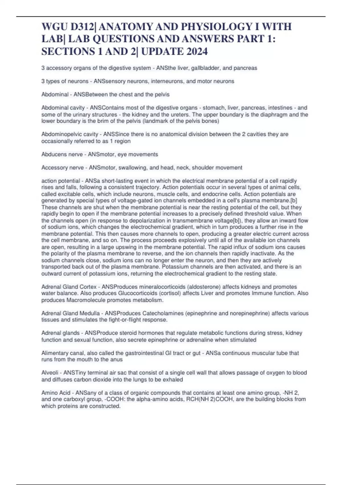 WGU D312| ANATOMY AND PHYSIOLOGY I WITH LAB| LAB QUESTIONS AND ANSWERS PART 1: SECTIONS 1 AND 2| UPDATE 2024