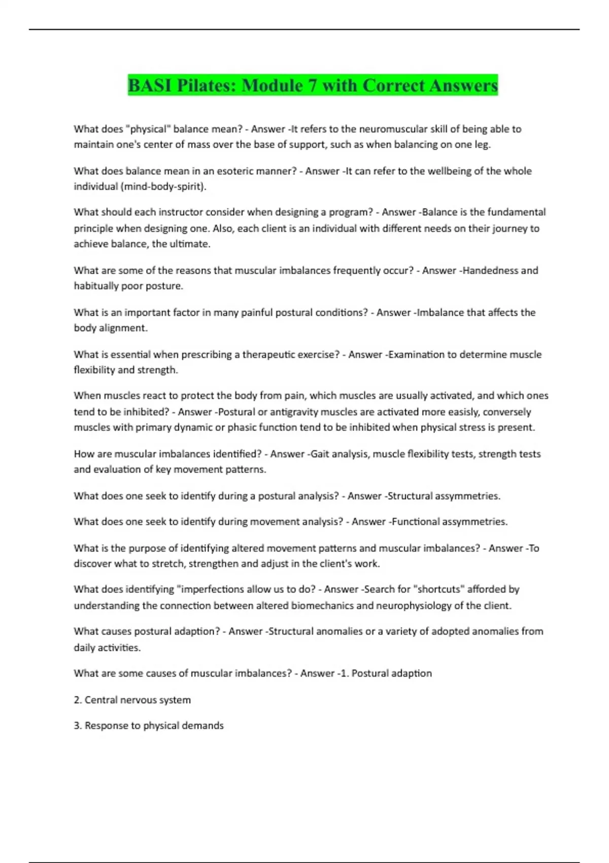 BASI Pilates: Module 7 with Correct Answers What does "physical" balance mean? - Answer -It refers to the neuromuscular skill of being able to maintain one's center of mass over the base of support, such as when balancing on one leg. What does balance mean in an esoteric manner? - Answer -It can refer to the wellbeing of the whole individual (mind-body-spirit). What should each instructor consider when designing a program? - Answer -Balance is the fundamental principle when designing one. Also, each client is an individual with different needs on their journey to achieve balance, the ultimate. What are some of the reasons that muscular imbalances frequently occur? - Answer -Handedness and habitually poor posture. What is an important factor in many painful postural conditions? - Answer -Imbalance that affects the body alignment. What is essential when prescribing a therapeutic exercise? - Answer -Examination to determine muscle flexibility and strength. When muscles react to protect the body from pain, which muscles are usually activated, and which ones tend to be inhibited? - Answer -Postural or antigravity muscles are activated more easisly, conversely muscles with primary dynamic or phasic function tend to be inhibited when physical stress is present. How are muscular imbalances identified? - Answer -Gait analysis, muscle flexibility tests, strength tests and evaluation of key movement patterns. What does one seek to identify during a postural analysis? - Answer -Structural assymmetries. What does one seek to identify during movement analysis? -