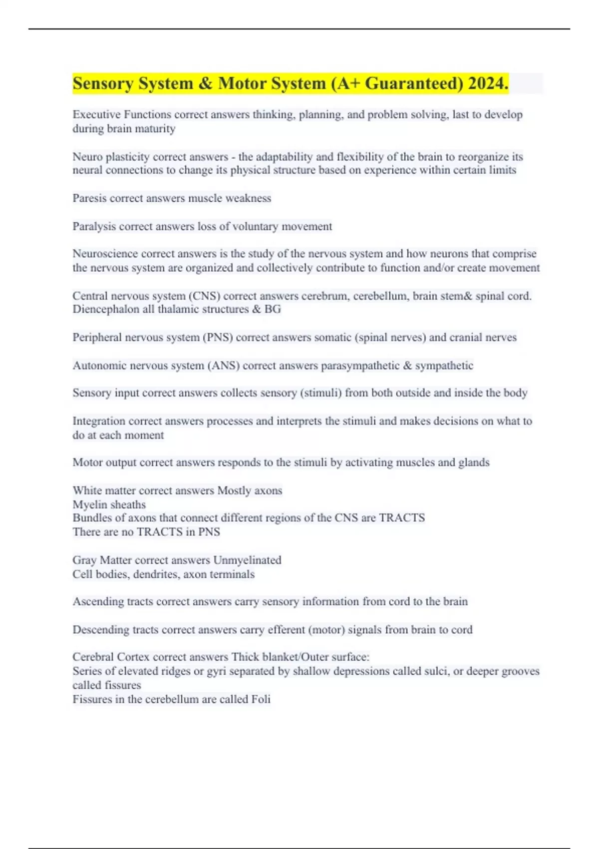 Executive Functions correct answers thinking, planning, and problem solving, last to develop during brain maturity Neuro plasticity correct answers - the adaptability and flexibility of the brain to reorganize its neural connections to change its physical structure based on experience within certain limits Paresis correct answers muscle weakness Paralysis correct answers loss of voluntary movement Neuroscience correct answers is the study of the nervous system and how neurons that comprise the nervous system are organized and collectively contribute to function and/or create movement Central nervous system (CNS) correct answers cerebrum, cerebellum, brain stem& spinal cord. Diencephalon all thalamic structures & BG Peripheral nervous system (PNS) correct answers somatic (spinal nerves) and cranial nerves Autonomic nervous system (ANS) correct answers parasympathetic & sympathetic Sensory input correct answers collects sensory (stimuli) from both outside and inside the body Integration correct answers processes and interprets the stimuli and makes decisions on what to do at each moment Motor output correct answers responds to the stimuli by activating muscles and glands White matter correct answers Mostly axons Myelin sheaths Bundles of axons that connect different regions of the CNS are TRACTS There are no TRACTS in PNS Gray Matter correct answers Unmyelinated Cell bodies, dendrites, axon terminals Ascending tracts correct answers carry sensory information from cord to the brain Descending tracts correct answers carry efferent (motor) signals from brain to cord Cerebral Cortex correct answers Thick blanket/Outer surface: Series of elevated ridges or gyri separated by shallow depressions called sulci, or deeper grooves called fissures Fissures in the cerebellum are called Foli