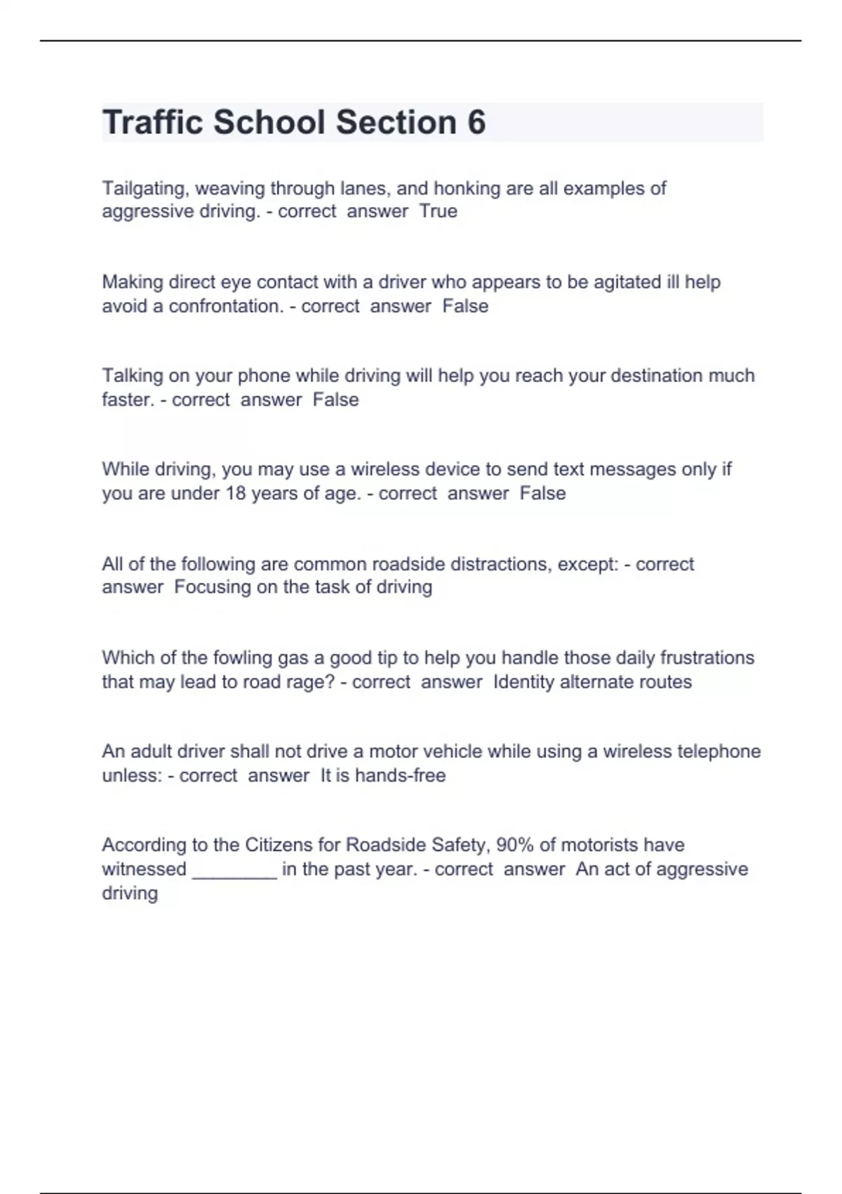 Traffic School Section 6 Question and answers already passed 2024 Tailgating, weaving through lanes, and honking are all examples of aggressive driving. - correct answer True Making direct eye contact with a driver who appears to be agitated ill help avoid a confrontation. - correct answer False Talking on your phone while driving will help you reach your destination much faster. - correct answer False While driving, you may use a wireless device to send text messages only if you are under 18 years of age. - correct answer False All of the following are common roadside distractions, except: - correct answer Focusing on the task of driving Which of the fowling gas a good tip to help you handle those daily frustrations that may lead to road rage? - correct answer Identity alternate routes An adult driver shall not drive a motor vehicle while using a wireless telephone unless: - correct answer It is hands-free According to the Citizens for Roadside Safety, 90% of motorists have witnessed ________ in the past year. - correct answer An act of aggressive driving