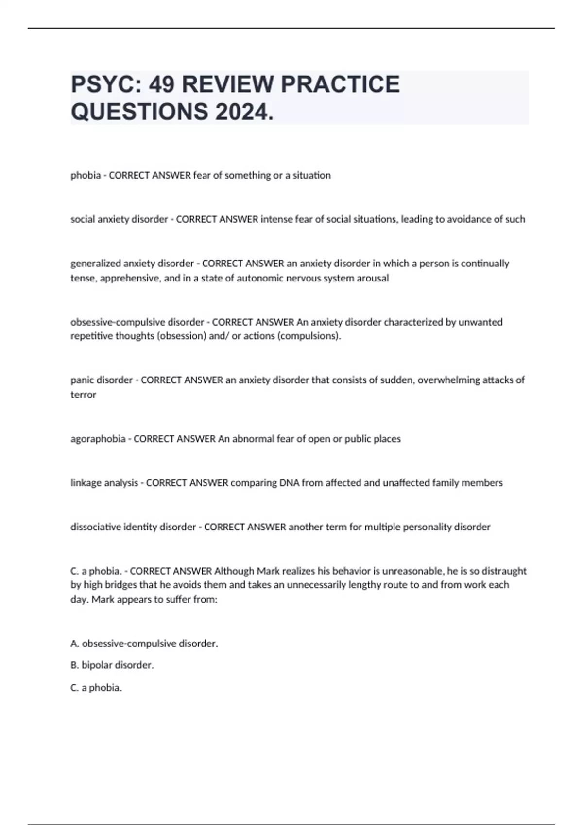 PSYC: 49 REVIEW PRACTICE QUESTIONS 2024. phobia - CORRECT ANSWER fear of something or a situation social anxiety disorder - CORRECT ANSWER intense fear of social situations, leading to avoidance of such generalized anxiety disorder - CORRECT ANSWER an anxiety disorder in which a person is continually tense, apprehensive, and in a state of autonomic nervous system arousal obsessive-compulsive disorder - CORRECT ANSWER An anxiety disorder characterized by unwanted repetitive thoughts (obsession) and/ or actions (compulsions). panic disorder - CORRECT ANSWER an anxiety disorder that consists of sudden, overwhelming attacks of terror agoraphobia - CORRECT ANSWER An abnormal fear of open or public places linkage analysis - CORRECT ANSWER comparing DNA from affected and unaffected family members dissociative identity disorder - CORRECT ANSWER another term for multiple personality disorder C. a phobia. - CORRECT ANSWER Although Mark realizes his behavior is unreasonable, he is so distraught by high bridges that he avoids them and takes an unnecessarily lengthy route to and from work each day. Mark appears to suffer from: A. obsessive-compulsive disorder. B. bipolar disorder. C. a phobia.
