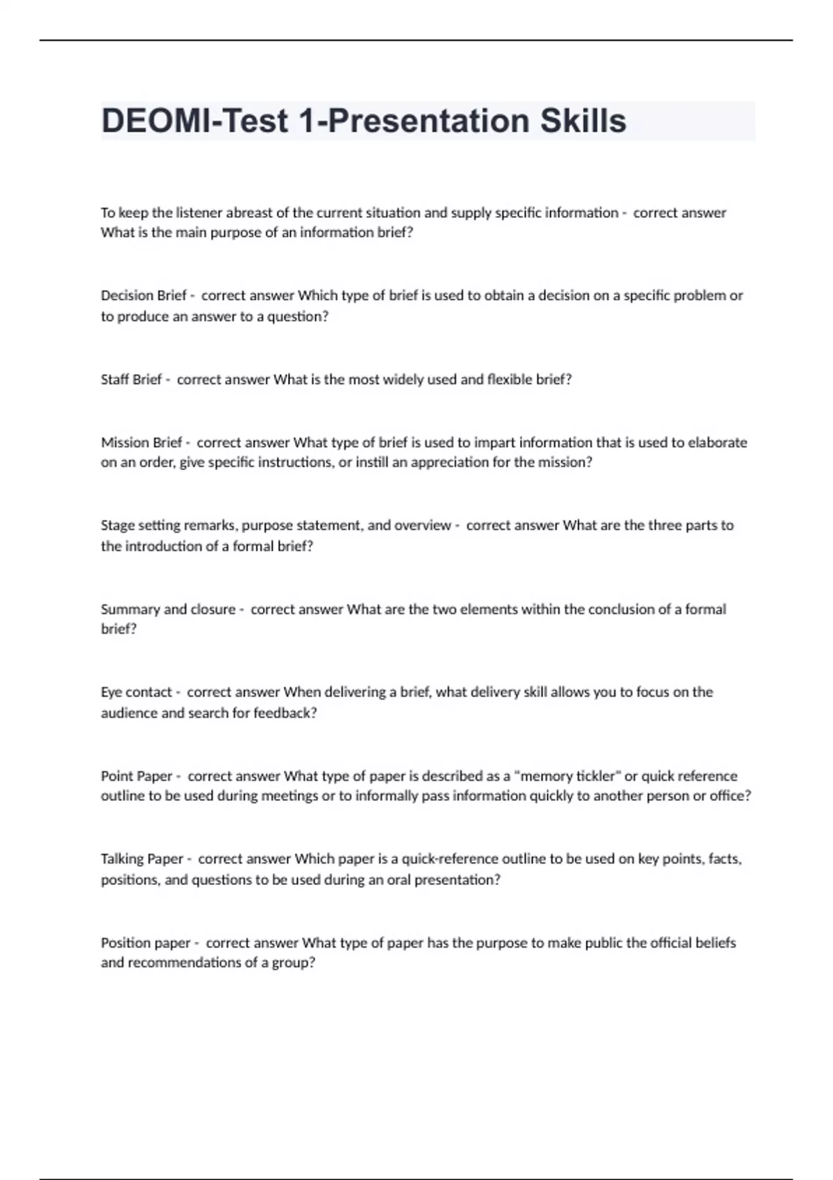 DEOMI-Test 1-Presentation Skills Questions with complete solution 2024 To keep the listener abreast of the current situation and supply specific information - correct answer What is the main purpose of an information brief? Decision Brief - correct answer Which type of brief is used to obtain a decision on a specific problem or to produce an answer to a question? Staff Brief - correct answer What is the most widely used and flexible brief? Mission Brief - correct answer What type of brief is used to impart information that is used to elaborate on an order, give specific instructions, or instill an appreciation for the mission? Stage setting remarks, purpose statement, and overview - correct answer What are the three parts to the introduction of a formal brief? Summary and closure - correct answer What are the two elements within the conclusion of a formal brief? Eye contact - correct answer When delivering a brief, what delivery skill allows you to focus on the audience and search for feedback? Point Paper - correct answer What type of paper is described as a "memory tickler" or quick reference outline to be used during meetings or to informally pass information quickly to another person or office?