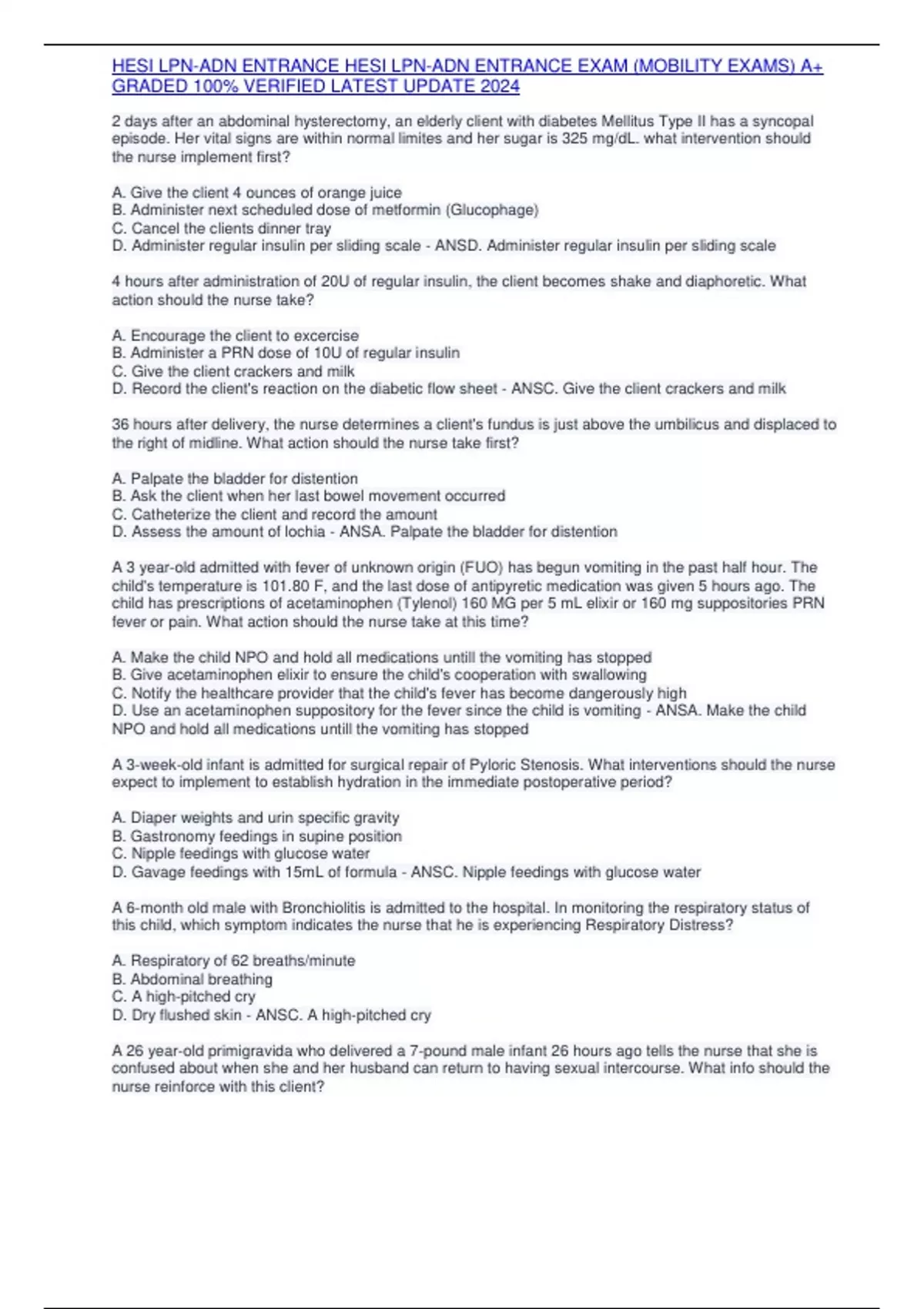 HESI LPN-ADN ENTRANCE HESI LPN-ADN ENTRANCE EXAM (MOBILITY EXAMS) A+ GRADED 100% VERIFIED LATEST UPDATE 2024