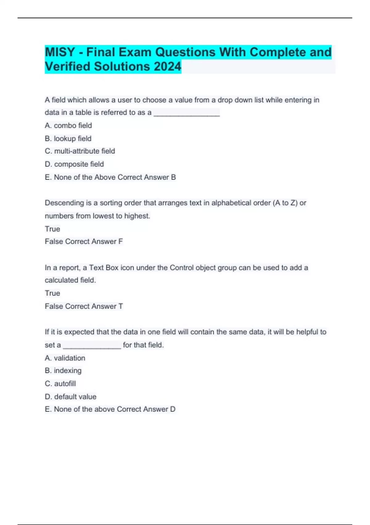 MISY - Final Exam Questions With Complete and Verified Solutions 2024 A field which allows a user to choose a value from a drop down list while entering in data in a table is referred to as a ________________ A. combo field B. lookup field C. multi-attribute field D. composite field E. None of the Above Correct Answer B Descending is a sorting order that arranges text in alphabetical order (A to Z) or numbers from lowest to highest. True False Correct Answer F In a report, a Text Box icon under the Control object group can be used to add a calculated field. True False Correct Answer T If it is expected that the data in one field will contain the same data, it will be helpful to set a ______________ for that field. A. validation B. indexing C. autofill D. default value E. None of the above Correct Answer D When creating a Lookup field in the table, developers must choose only one value for a Lookup field. True False Correct Answer F Once a report was created, a user can click on _________ icon to add more fields to a report. A. Add existing fields B. Property Sheet C. Additional field