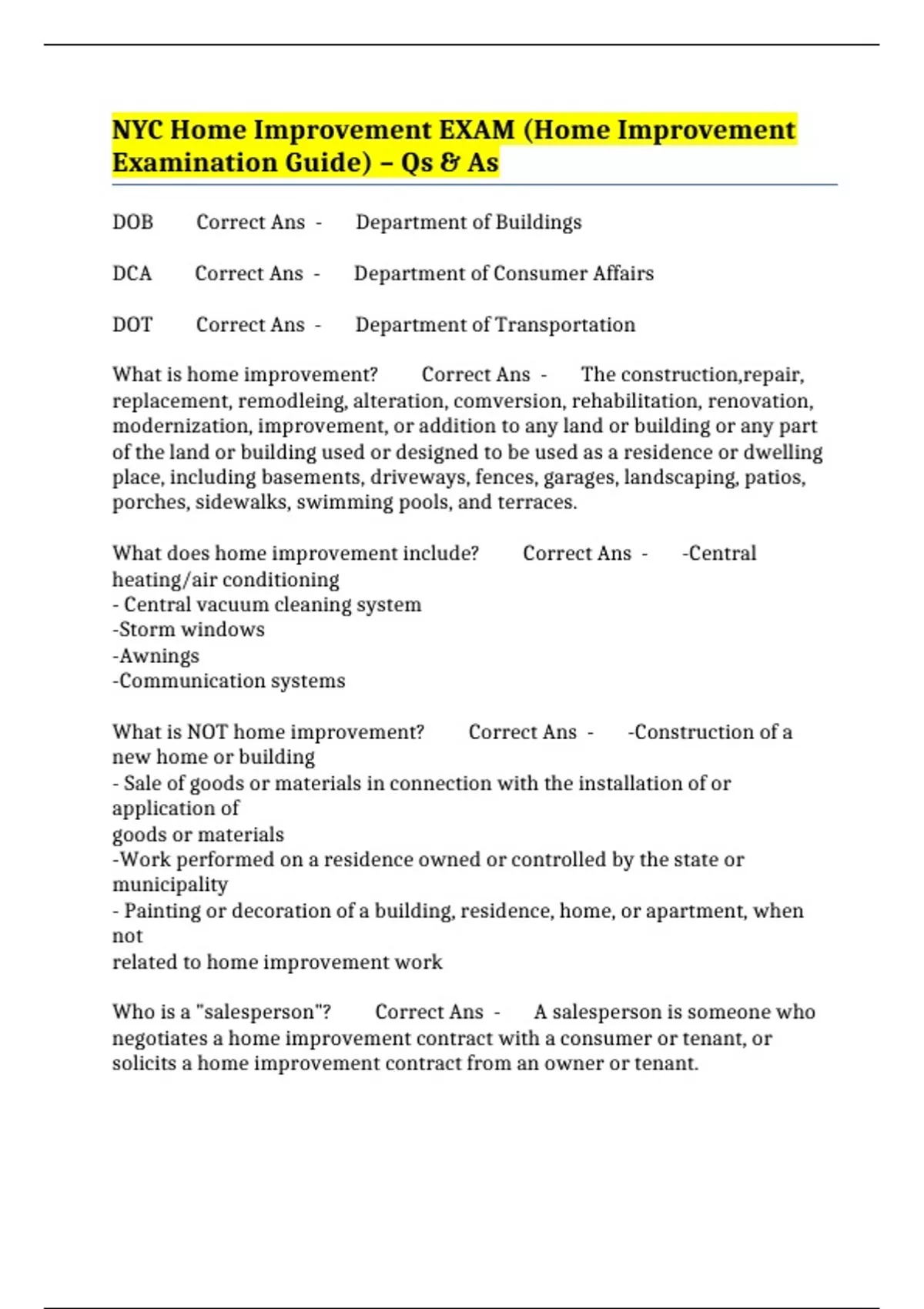 NYC Home Improvement EXAM (Home Improvement Examination Guide) – Qs & As