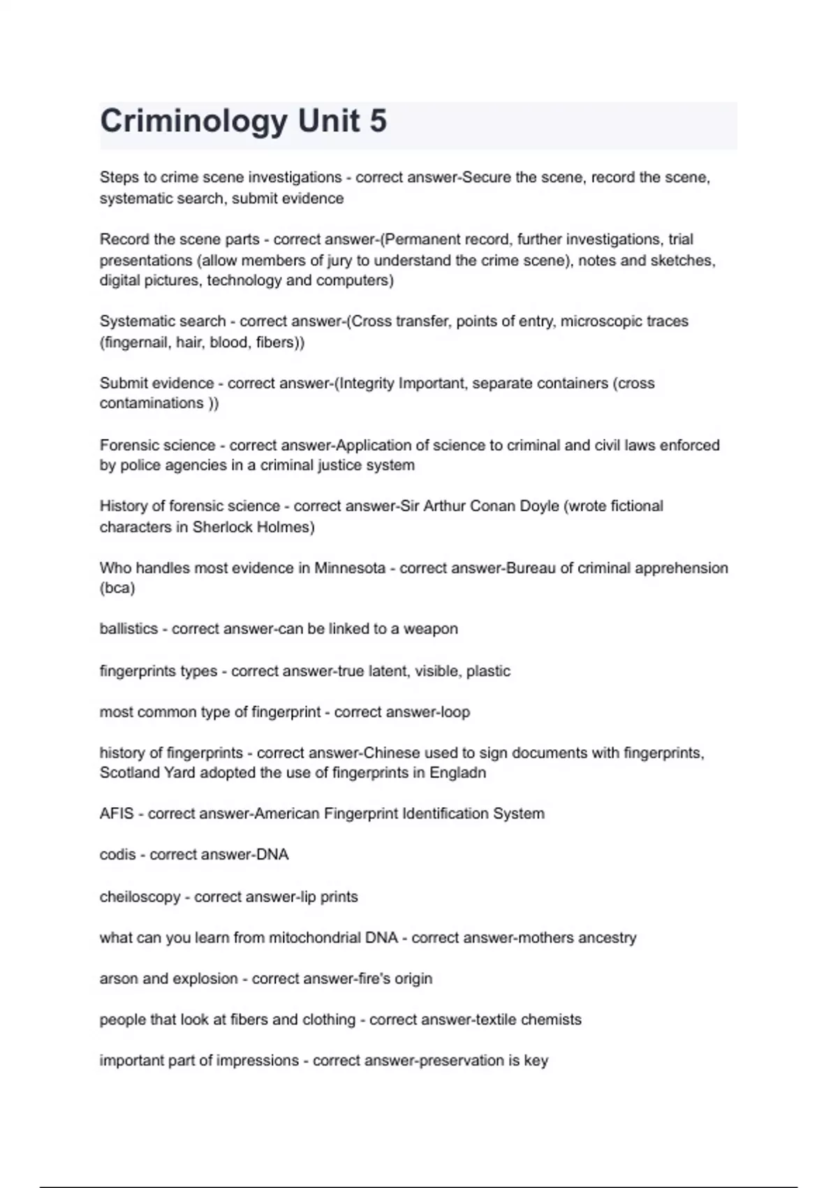 Steps to crime scene investigations - correct answer-Secure the scene, record the scene, systematic search, submit evidence Record the scene parts - correct answer-(Permanent record, further investigations, trial presentations (allow members of jury to understand the crime scene), notes and sketches, digital pictures, technology and computers) Systematic search - correct answer-(Cross transfer, points of entry, microscopic traces (fingernail, hair, blood, fibers)) Submit evidence - correct answer-(Integrity Important, separate containers (cross contaminations )) Forensic science - correct answer-Application of science to criminal and civil laws enforced by police agencies in a criminal justice system History of forensic science - correct answer-Sir Arthur Conan Doyle (wrote fictional characters in Sherlock Holmes) Who handles most evidence in Minnesota - correct answer-Bureau of criminal apprehension (bca) ballistics - correct answer-can be linked to a weapon fingerprints types - correct answer-true latent, visible, plastic most common type