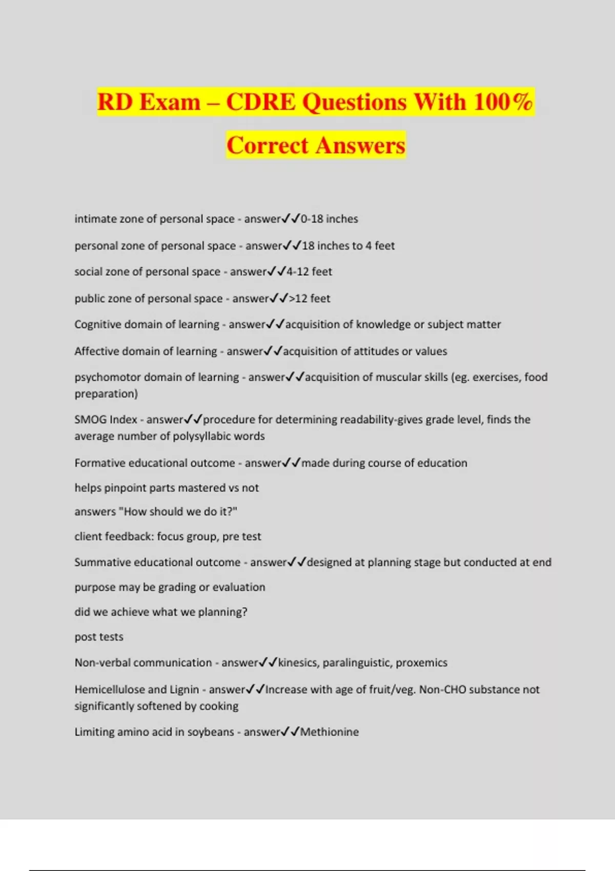 RD Exam – CDRE Questions With 100% Correct Answers intimate zone of personal space - answer0-18 inches personal zone of personal space - answer18 inches to 4 feet social zone of personal space - answer4-12 feet public zone of personal space - answer12 feet Cognitive domain of learning - answeracquisition of knowledge or subject matter Affective domain of learning - answeracquisition of attitudes or values psychomotor domain of learning - answeracquisition of muscular skills (eg. exercises, food preparation) SMOG Index - answerprocedure for determining readability-gives grade level, finds the average number of polysyllabic words Formative educational outcome - answermade during course of education helps pinpoint parts mastered vs not answers "How should we do it?" client feedback: focus group, pre test Summative educational outcome - answerdesigned at planning stage but conducted at end purpose may be grading or evaluation did we achieve what we planning? post tests Non-verbal communication - answerkinesics, paralinguistic, proxemics Hemicellulose and Lignin - answerIncrease with age of fruit/veg. Non-CHO substance not significantly softened by cooking Limiting amino acid in soybeans - answerMethionine Soy protein concentrate - answer/= 70% protein Soy protein isolates - answer/= 90% protein Proto pectin changes as fruit ripens - answerChanges to pectin (ripe fruit) - pectic acid (overripe fruit) Prevention of fruit darkening (fruits low in vitamin C) - answerDip in citrus juice, add sugar before freezing, heat to boiling Brix scale - answerHydrometer scale designed to indicate the percentage concentration of sugar in sugar solutions How is concentration of sugar in syrup expressed on a product label? - answerextra light, light, heavy, extra heavy syrup green pigment - answerchlorophyll - insoluble in H2O Pheophytin - answerChlorophyll in acid (olive green) Chlorophyllin - answerChlorophyll in alkaline (bright green, mushy as hemicellulose breaks down) Yellow/Orange Pigments - answerPigment - Carotenoids (insoluble in H2O) Pigments least affected by changes in pH - answerCarotenoids Lycopenes - answerPigment - Antioxidant phytochemical, contributes to red colour in tomato, watermelon, apricots Flavonoids - answeranthocyanins and anthoxanthins/flavones Red, blue, purple pigments - answeranthocyanins - soluble in water - bright red in acid - blueish in alkaline Anthoxanthins or flavones pigments - answerwhite -soluble in water -colorless in acid -yellow in alkaline Tannins - answercause astringent feeling in mouth (underripe banana) Solanine - answera poisonous substance found in potatoes that have turned green Boiling acidic vegetables that need more time to cook - answerUse more water, no lid Can size #10 - answer6/case wt: 6lb 9oz volume: 13cups servings: 20-25 Can size #3 - answer12/case wt: 46oz volume: 5.75 cups servings: 12-15 Can size #2 1/2 - answer24/case wt: 1lb 13oz volume: 3 1/2 cups servings: 6-8 Can size #2 - answer24/case wt: 1 lb 4oz volume: 2 1/2 cups servings: 4-6 Can size #300 - answer24/case wt: 14 - 16oz volume: 1 3/4 cup servings: 3-4 Collagen - answerstructural part of tendon that surrounds muscle In heat is hydrolyzed to gelatin Elastin - answerFound in ligaments, cartilage (yellow colour) Resistant to heat