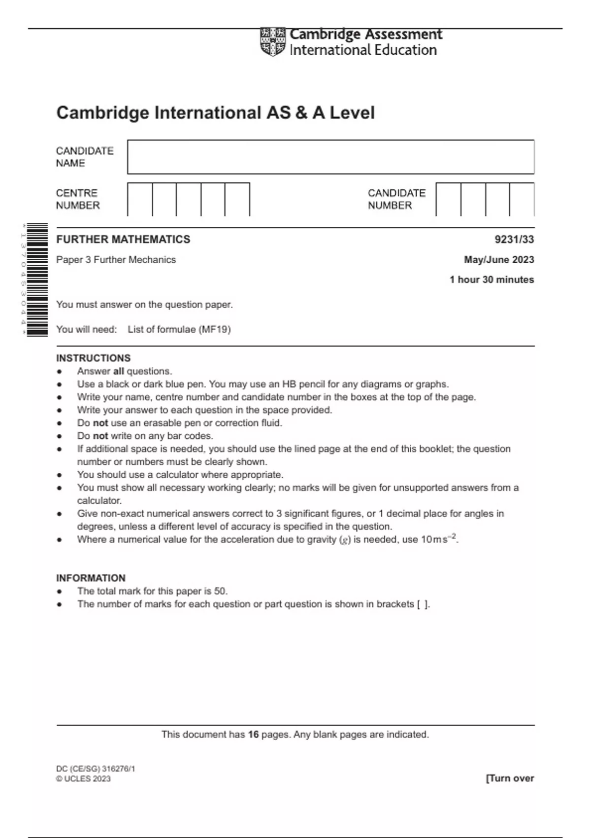 As & A Level Further Mathematics 9231/33 Paper 3 Further Mechanics May/June 2023 Authentic Marking Scheme Attached