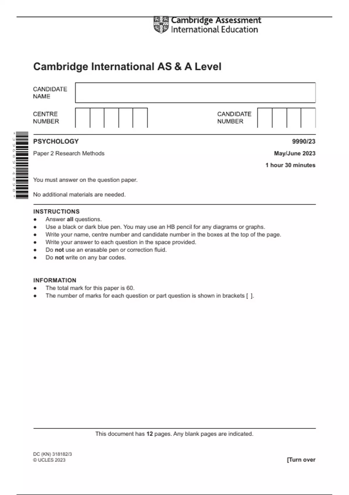 As & A Level Psychology 9990/23 Paper 2 Research Methods May/June 2023 Authentic Marking Scheme Attached