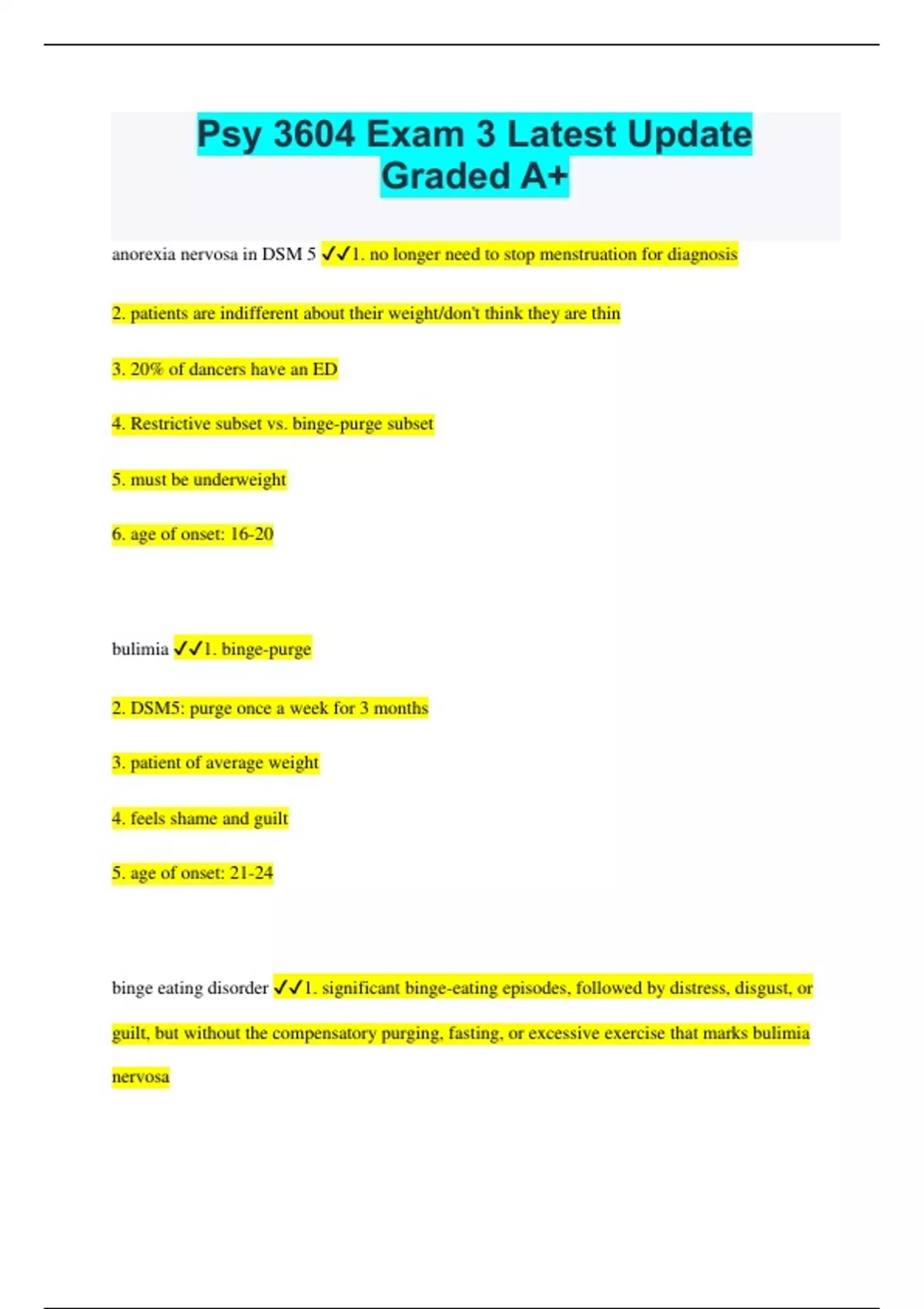 Psy 3604 Exam 3 Latest Update Graded A+ anorexia nervosa in DSM 5 1. no longer need to stop menstruation for diagnosis 2. patients are indifferent about their weight/don't think they are thin 3. 20% of dancers have an ED 4. Restrictive subset vs. binge-purge subset 5. must be underweight 6. age of onset: 16-20 bulimia 1. binge-purge 2. DSM5: purge once a week for 3 months 3. patient of average weight 4. feels shame and guilt 5. age of onset: 21-24 binge eating disorder 1. significant binge-eating episodes, followed by distress, disgust, or guilt, but without the compensatory purging, fasting, or excessive exercise that marks bulimia nervosa 2. age of onset: 30-50 Prevalence of AN 0.3-0.9% ED prevalence Prevalence of BN 1% world wide, 1.5% in US ED prevalence Prevalence of BED 2% world wide, most common 2-3.5% in US ED prevalence Medical complications of AN 1. 5x higher mortality rate 2. thin brittle hair and nails, lanugo (downy hair) 3. cold, poor circulation, Vit B deficiency 4. osteoporosis risk 5. irregular heartbeat, electrolyte imbalance medical complications of BN 1. Electrolyte imbalance 2. Erosion of dental enamel 3. Hypersensitive gag reflex 4. Enlarged salivary glands results in: puffy appearance of face 5. Ruptured esophagus or stomach 6. less fatal than AN AN outcomes 1. suicide risk increase 18x 2. 50-60% reach full recovery BN outcomes 1. 25-30% of cases attempt suicide, less succeed 2. 70% recover BED outcomes 60% recover crossover between ED 1. restrictive and binging AN crossover frequently 2. 1/3 go from AN to BN (weight change) 3. 9-14% go from BN to AN (weight change) 4. 10% of BED to BN 5. no crossover between AN and BED comorbidity AN 1. depression 2. OCD 3. anxious or avoidant personality disorders 4. self harm comorbidity BN 1. depression 2. OCD 3. substance abuse 4. anxious or avoidant personality disorders 5. self harm BED comorbidity 1. depression