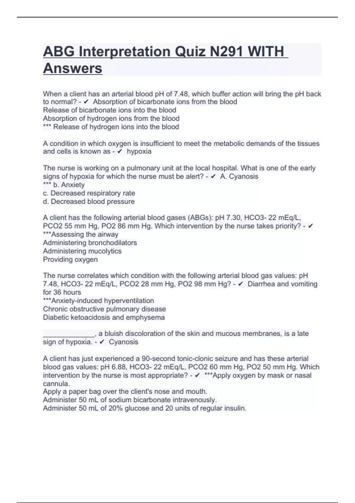 A client has just experienced a 90-second tonic-clonic seizure and has these arterial