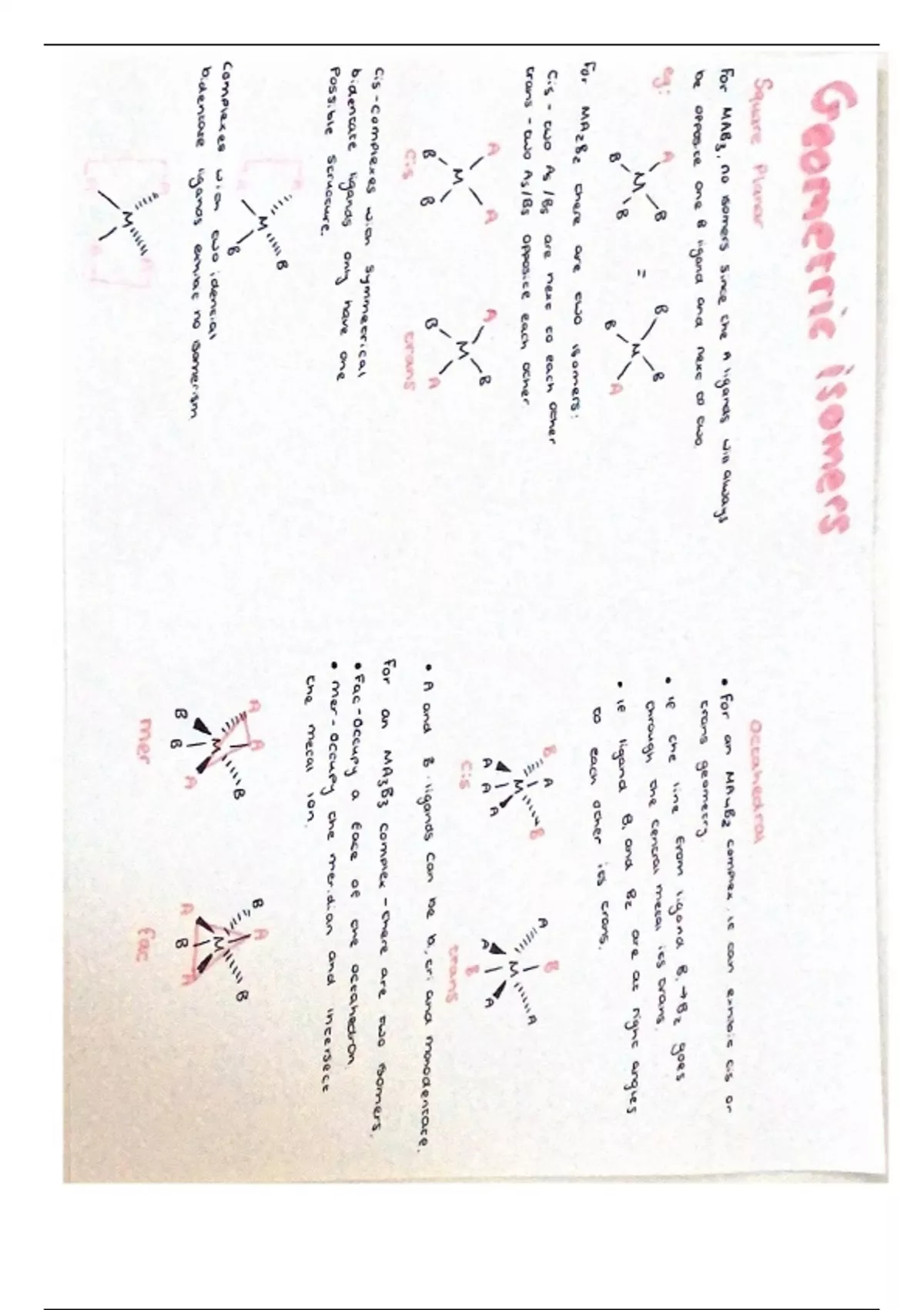 A clear overview on the effect of geometric isomers on both square planar and octahedral geometries. Diagrams are used to help visualise how these isomers will look. Cis, Trans, Mer and Fac isomers are explained. Perfect for Advanced Higher, A-Level and University chemistry.