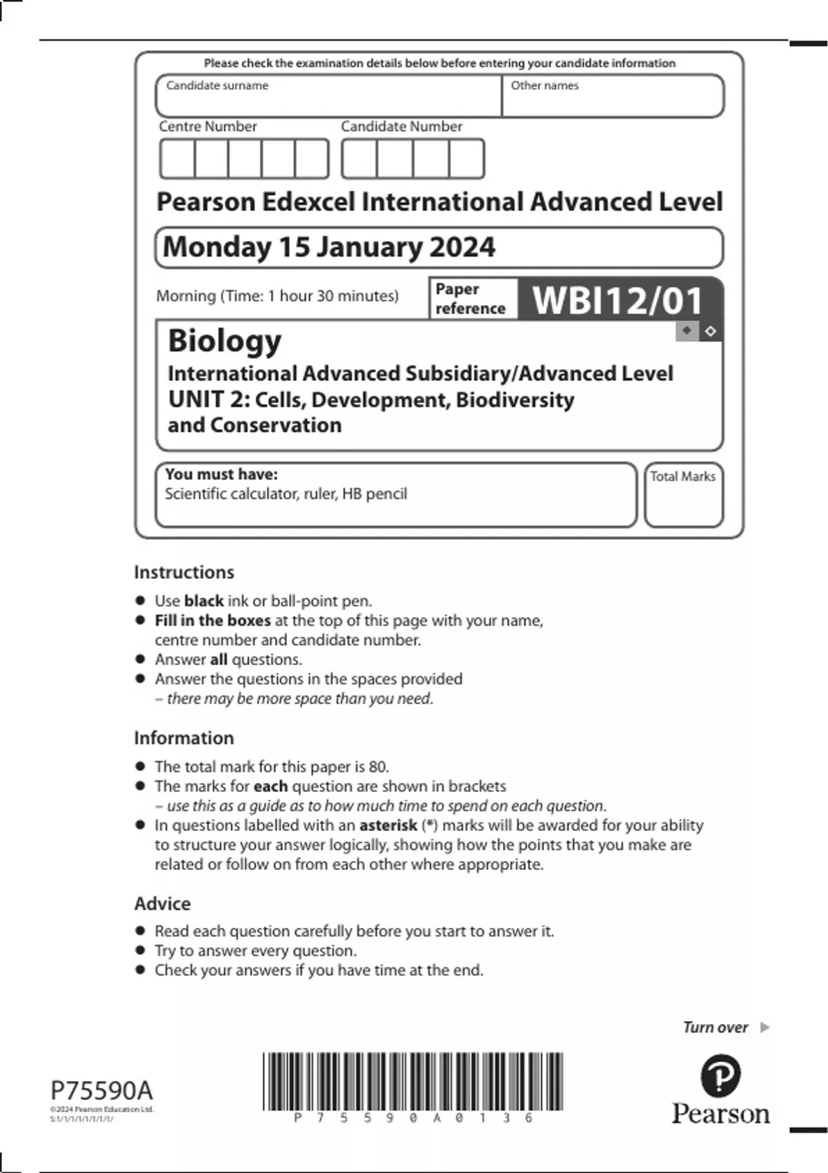 Pearson Edexcel AS/ A-Level Biology UNIT 2: Cells, Development, Biodiversity and Conservation January 2024 Authentic Marking Scheme Attached