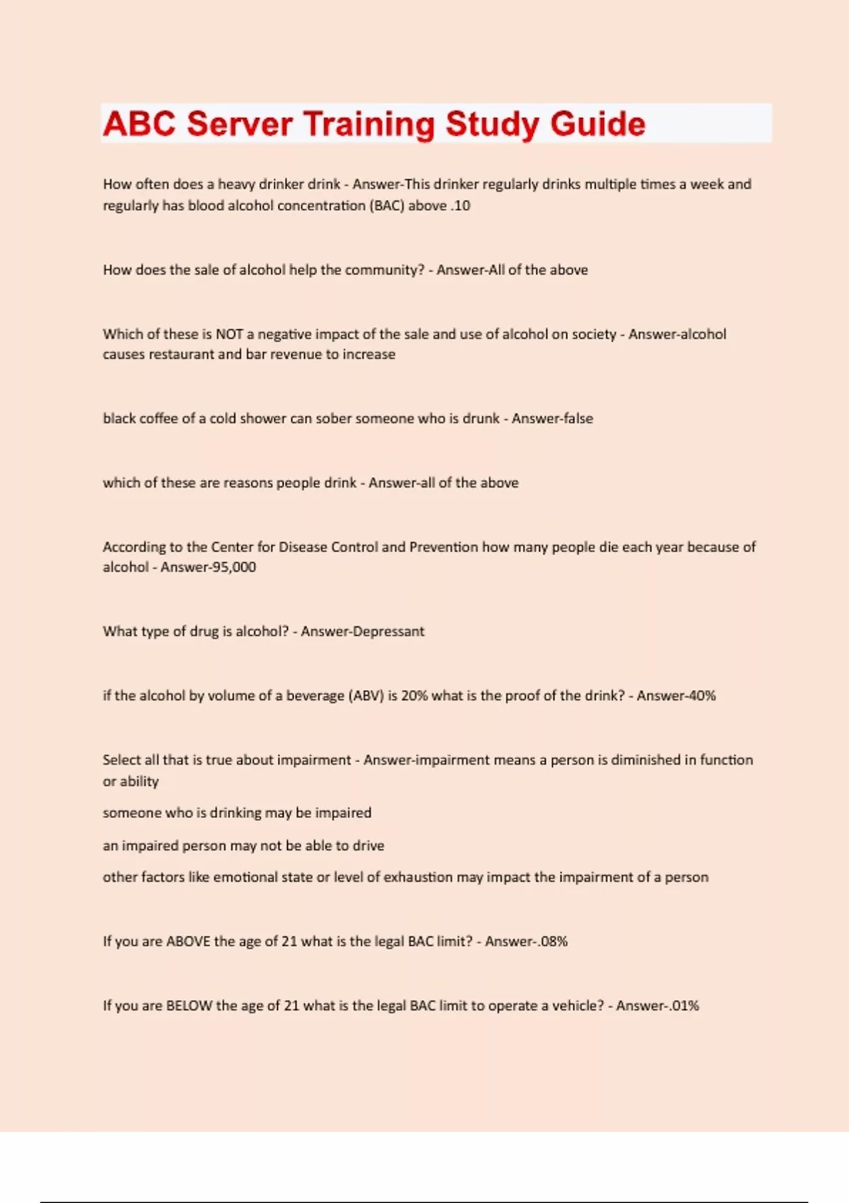 How often does a heavy drinker drink - Answer-This drinker regularly drinks multiple times a week and regularly has blood alcohol concentration (BAC) above .10 How does the sale of alcohol help the community? - Answer-All of the above Which of these is NOT a negative impact of the sale and use of alcohol on society - Answer-alcohol causes restaurant and bar revenue to increase black coffee of a cold shower can sober someone who is drunk - Answer-false which of these are reasons people drink - Answer-all of the above According to the Center for Disease Control and Prevention how many people die each year because of alcohol - Answer-95,000 What type of drug is alcohol? - Answer-Depressant if the alcohol by volume of a beverage (ABV) is 20% what is the proof of the drink? - Answer-40% Select all that is true about impairment - Answer-impairment means a person is diminished in function or ability someone who is drinking may be impaired an impaired person may not be able to drive other factors like emotional state or level of exhaustion may impact the impairment of a person If you are ABOVE the age of 21 what is the legal BAC limit? - Answer-.08% If you are BELOW the age of 21 what is the legal BAC limit to operate a vehicle? - Answer-.01%A person is considered drunk driving by legal standards - Answer-when they are driviing with a blood alcohol content (BAC) above the limit set by the state. Select all that apply: What effects does alcohol have when operating a vehicle - Answer-reduces coordination reduces reaction time increases drowsiness reduces concentration impairs vision drinking alcohol can impair both motor skills and cognitive functioning - Answer-true