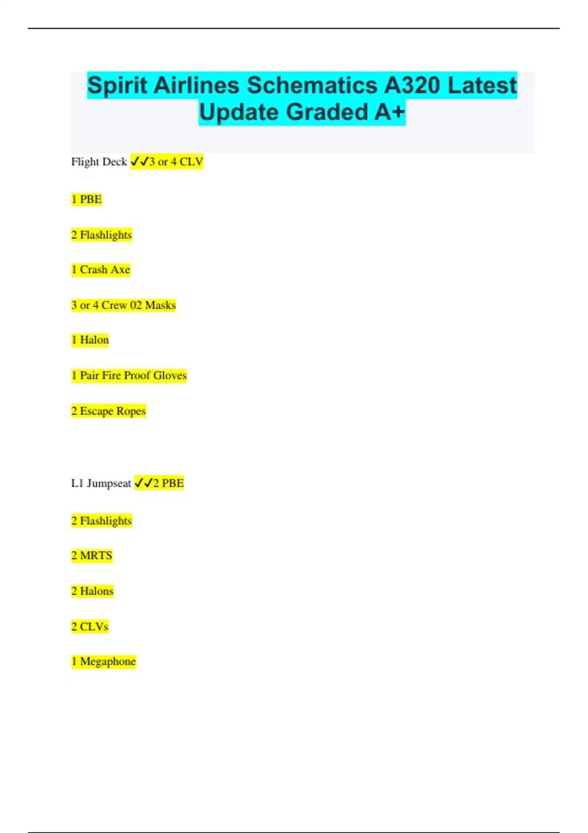 Spirit Airlines Schematics A320 Latest Update Graded A+ Flight Deck 3 or 4 CLV 1 PBE 2 Flashlights 1 Crash Axe 3 or 4 Crew 02 Masks 1 Halon 1 Pair Fire Proof Gloves 2 Escape Ropes L1 Jumpseat 2 PBE 2 Flashlights 2 MRTS 2 Halons 2 CLVs 1 Megaphone Forward Galley 2 Survival Kits 4 POB 1 BB 1 FAK 8 02 Masks Forward Spacer Bin (First OHB) 1 Demo Kit (A/C L) 1 FAK (A/C R) 2 EMKs (1 A/C L, 1 A/C R) Overwing Spacer Bins 2 Demo Kits (1 A/C L, 1 A/C R) 4 Life Lines (2 A/C L, 2 A/C R) L2 Jumpseat 1 PBE 1 Flashlight 1 MRT 1 megaphone 1 Flashlight