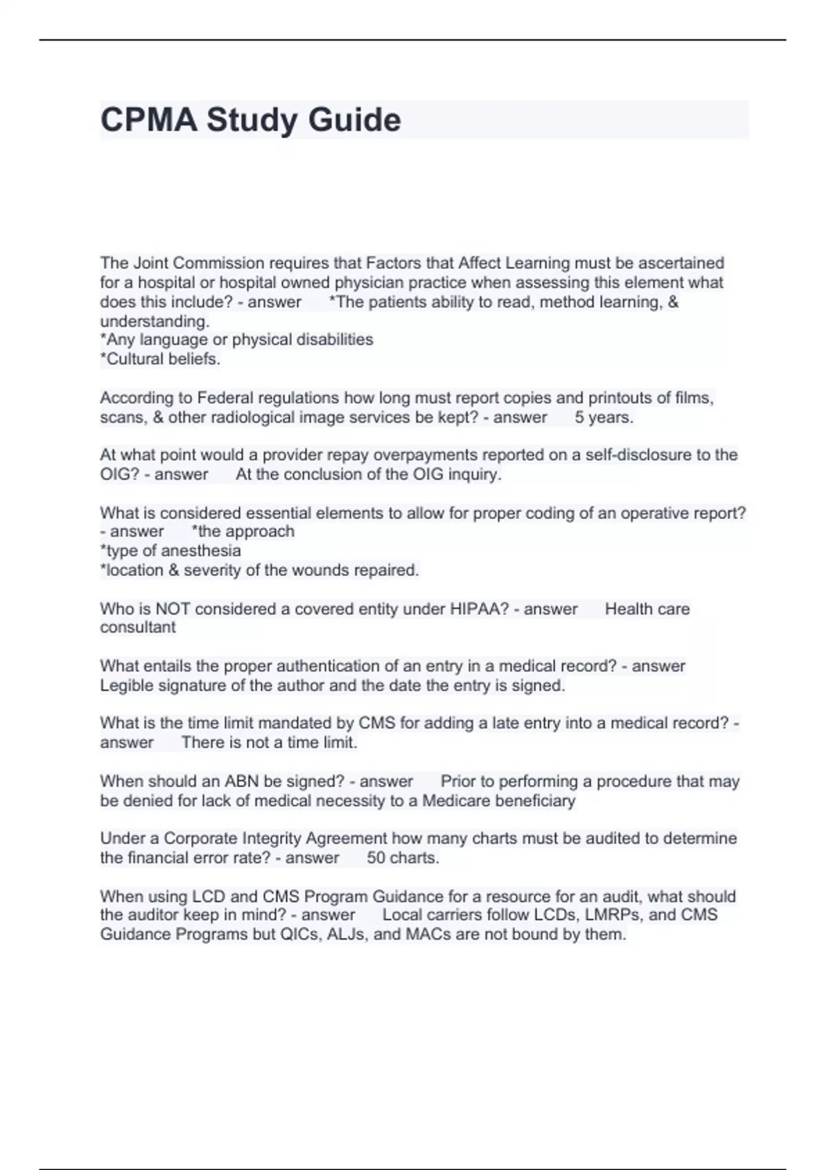 CPMA Study Guide Questions and Answers 2024