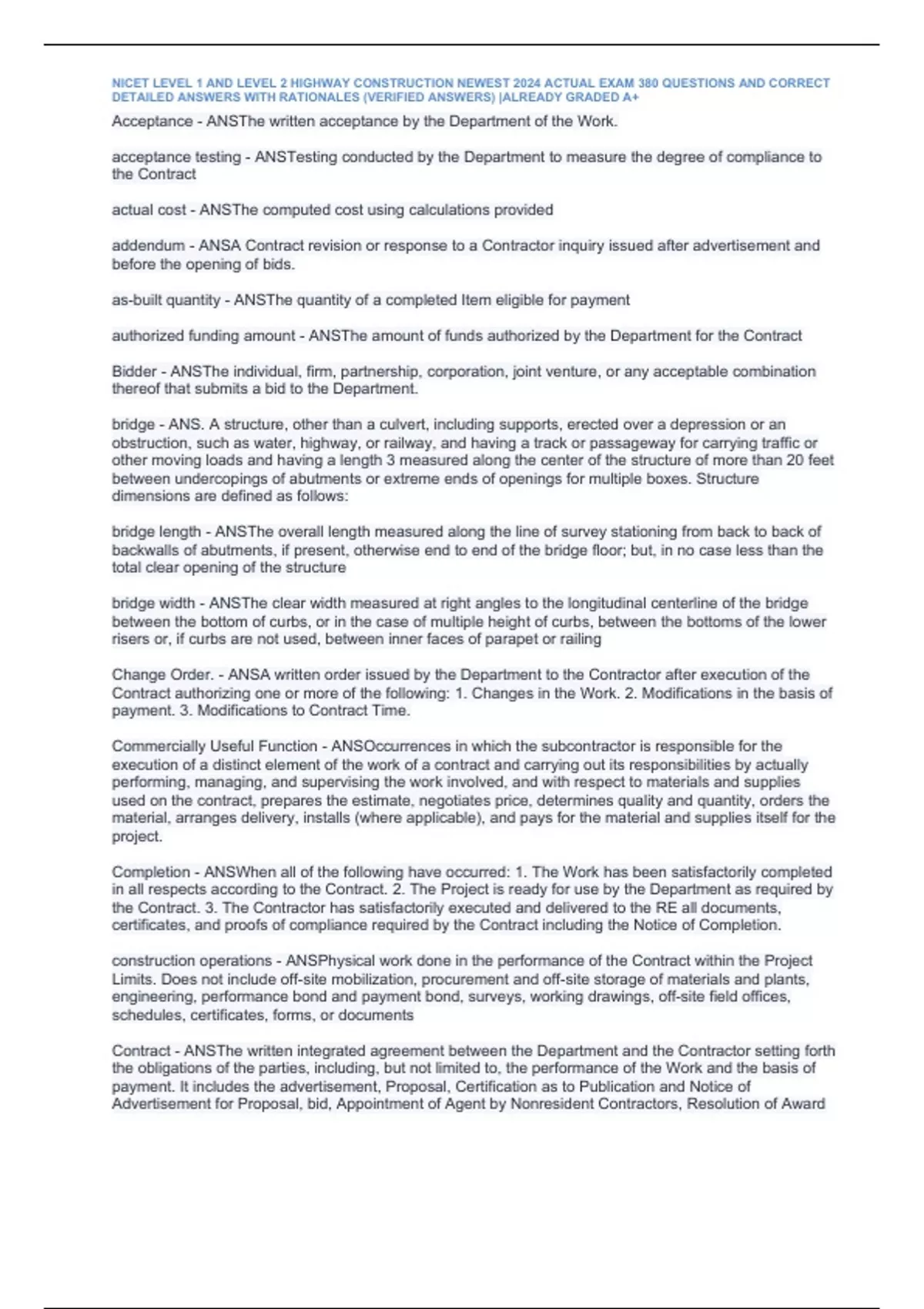 , NICET LEVEL 1 AND LEVEL 2 HIGHWAY CONSTRUCTION NEWEST 2024 ACTUAL EXAM 380 QUESTIONS AND CORRECT