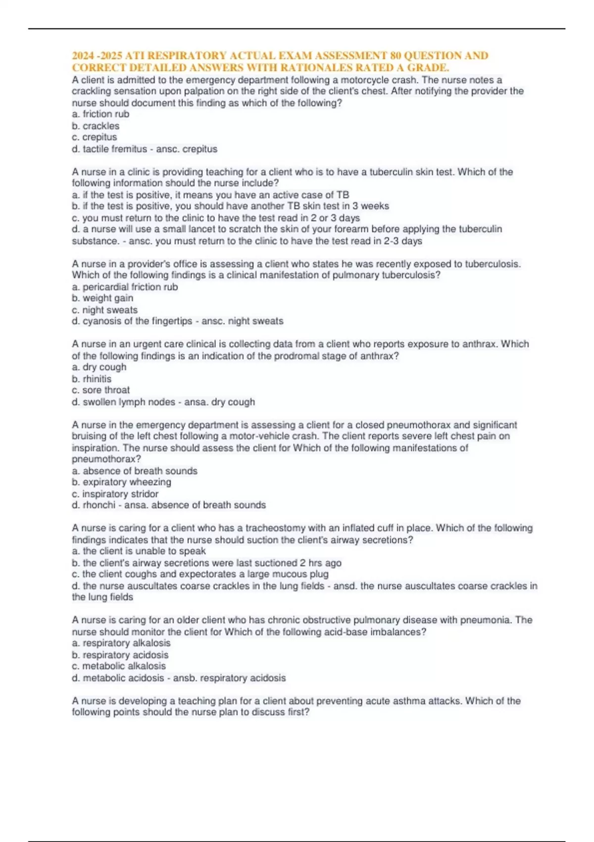 , 2024 -2025 ATI RESPIRATORY ACTUAL EXAM ASSESSMENT 80 QUESTION AND
