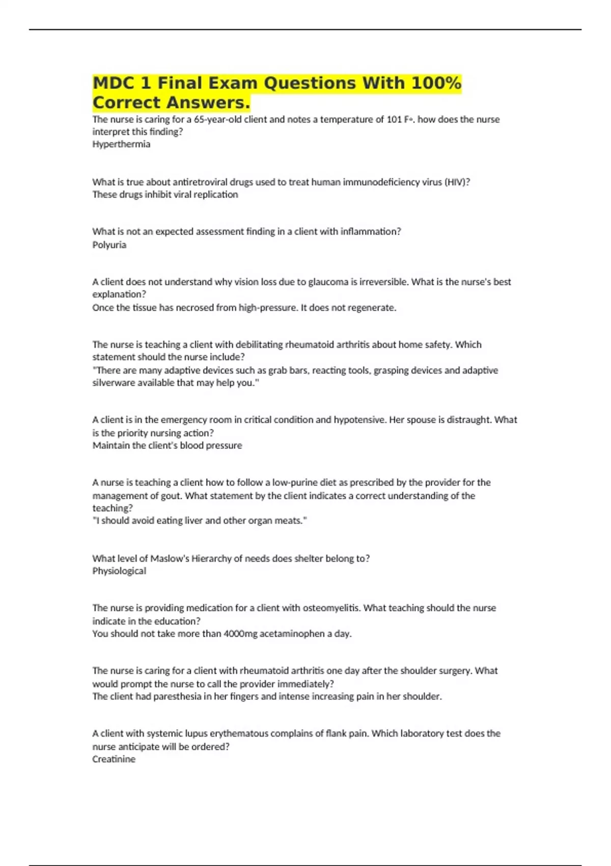 MDC 1 Final Exam Questions With 100% Correct Answers. The nurse is caring for a 65-year-old client and notes a temperature of 101 F◦. how does the nurse interpret this finding? Hyperthermia What is true about antiretroviral drugs used to treat human immunodeficiency virus (HIV)? These drugs inhibit viral replication What is not an expected assessment finding in a client with inflammation? Polyuria A client does not understand why vision loss due to glaucoma is irreversible. What is the nurse's best explanation? Once the tissue has necrosed from high-pressure. It does not regenerate. The nurse is teaching a client with debilitating rheumatoid arthritis about home safety. Which statement should the nurse include? "There are many adaptive devices such as grab bars, reacting tools, grasping devices and adaptive silverware available that may help you." A client is in the emergency room in critical condition and hypotensive. Her spouse is distraught. What is the priority nursing action? Maintain the client's blood pressure A nurse is teaching a client how to follow a low-purine diet as prescribed by the provider for the management of gout. What statement by the client indicates a correct understanding of the teaching? "I should avoid eating liver and other organ meats." What level of Maslow's Hierarchy of needs does shelter belong to? Physiological The nurse is providing medication for a client with osteomyelitis. What teaching should the nurse indicate in the education? You should not take more than 4000mg acetaminophen a day. The nurse is caring for a client with rheumatoid arthritis one day after the shoulder surgery. What would prompt the nurse to call the provider immediately? The client had paresthesia in her fingers and intense increasing pain in her shoulder. A client with systemic lupus erythematous complains of flank pain. Which laboratory test does the nurse anticipate will be ordered? Creatinine