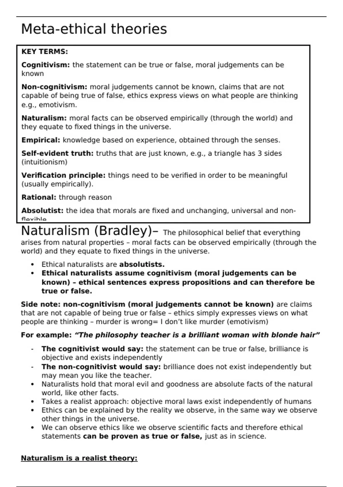 This 14 page booklet includes everything there is to know about meta-ethics! Inside there is a table with all the key terms and their definitions, explanations of naturalism, intuitionism, emotivism and Mackie's error theory each with their own strengths and weaknesses. At the end there is an array of detailed essay plans. The questions are- Question 1 - Consider to what extent intuitionism solved the problems of ethical language. Question 2 - ‘To what extent is the meaning of the word ‘good’ the defining question in the study of ethics’ Discuss. Question 3 - ‘No theories of ethical language fully solve all the problems’ Discuss. Question 4 - Do ‘good’ and ‘bad’ reflect only what is in the mind of the speaker?. Question 5 - Does common sense suggest that people just know within themselves what is good and bad?. Question 6 - 'Ethical Naturalism is true'. Question 7 - Good is best explained by intuitionism . This booklet is all I used to achieve an A* in my exam! Enjoy and good luck :)