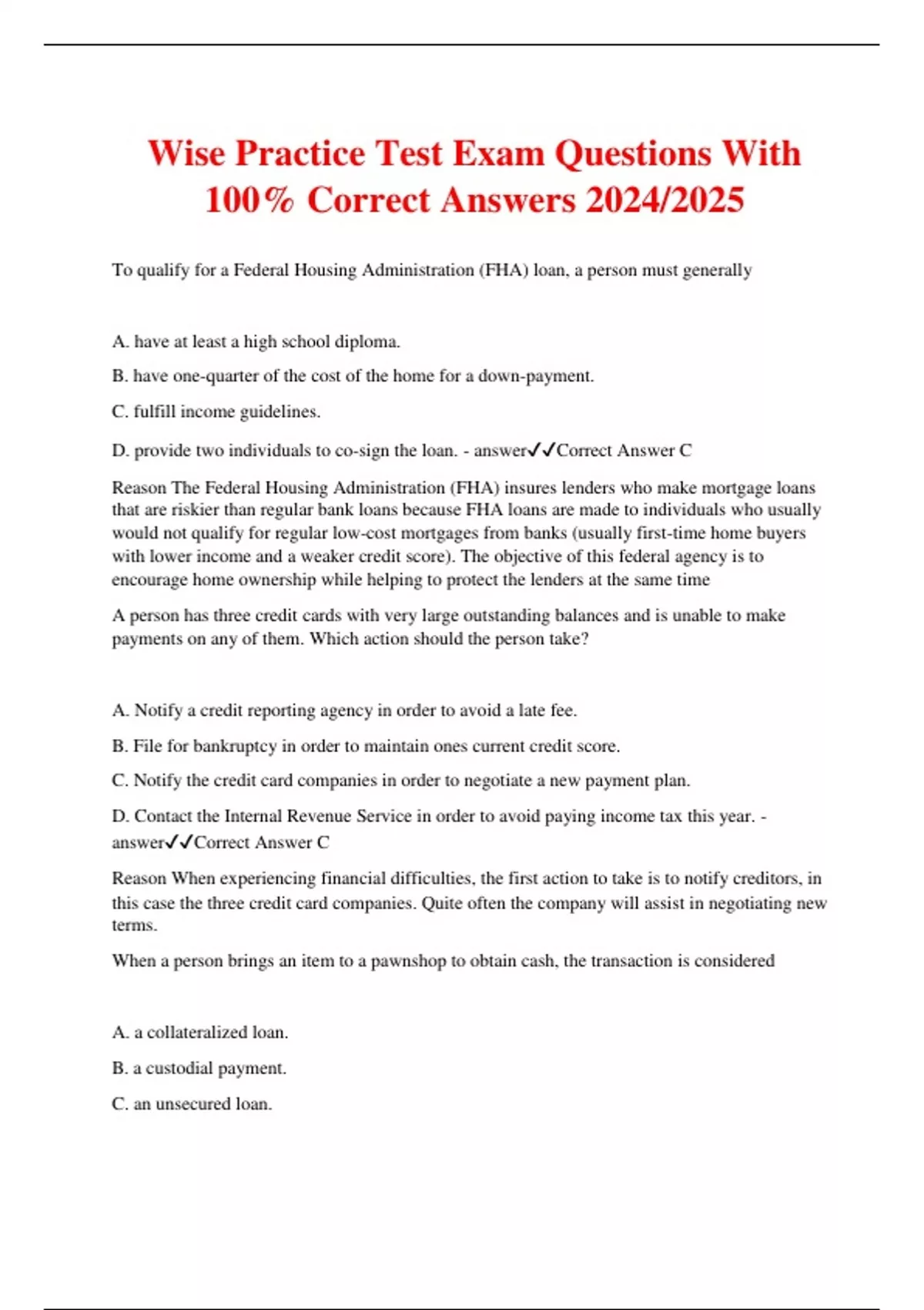 Wise Practice Test Exam Questions With 100% Correct Answers 2024/2025 To qualify for a Federal Housing Administration (FHA) loan, a person must generally A. have at least a high school diploma. B. have one-quarter of the cost of the home for a down-payment. C. fulfill income guidelines. D. provide two individuals to co-sign the loan. - answerCorrect Answer C Reason The Federal Housing Administration (FHA) insures lenders who make mortgage loans that are riskier than regular bank loans because FHA loans are made to individuals who usually would not qualify for regular low-cost mortgages from banks (usually first-time home buyers with lower income and a weaker credit score). The objective of this federal agency is to encourage home ownership while helping to protect the lenders at the same time A person has three credit cards with very large outstanding balances and is unable to make payments on any of them. Which action should the person take? A. Notify a credit reporting agency in order to avoid a late fee. B. File for bankruptcy in order to maintain ones current credit score. C. Notify the credit card companies in order to negotiate a new payment plan. D. Contact the Internal Revenue Service in order to avoid paying income tax this year. - answerCorrect Answer C Reason When experiencing financial difficulties, the first action to take is to notify creditors, in this case the three credit card companies. Quite often the company will assist in negotiating new terms. When a person brings an item to a pawnshop to obtain cash, the transaction is considered A. a collateralized loan. B. a custodial payment. C. an unsecured loan.
