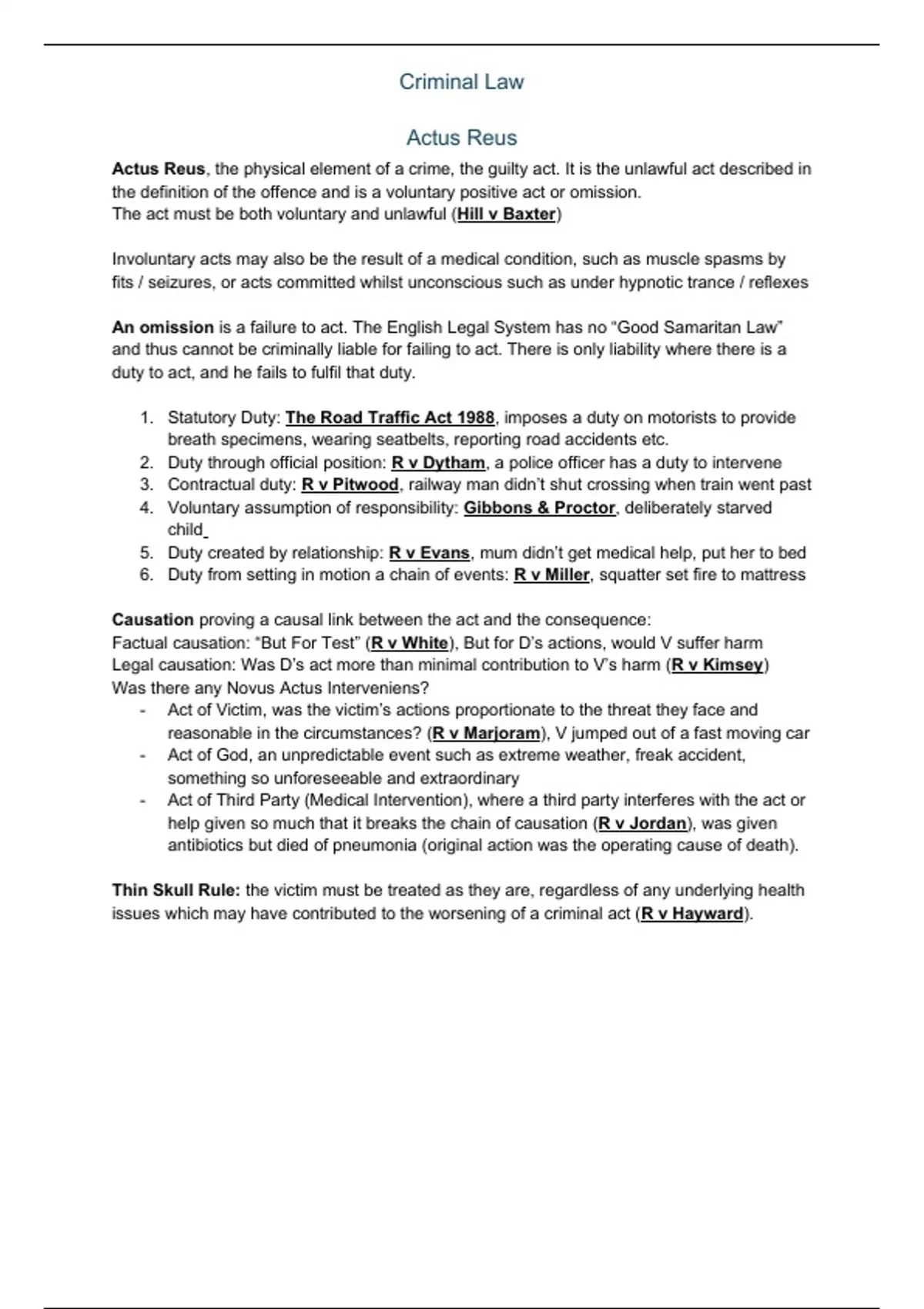 Factual causation: “But For Test” (R v White), But for D’s actions, would V suffer harm