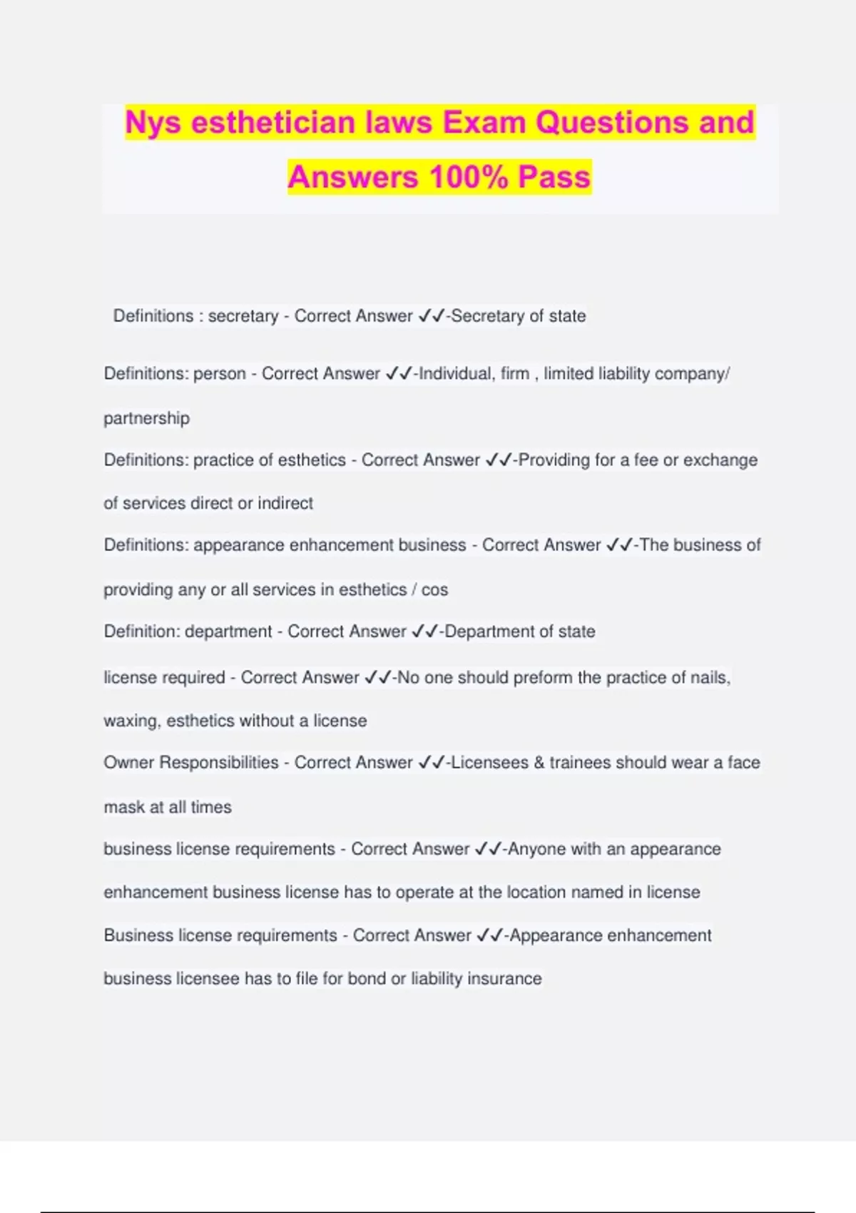 Nys esthetician laws Exam Questions and Answers 100% Pass Definitions : secretary - Correct Answer ️️ -Secretary of state Definitions: person - Correct Answer ️️ -Individual, firm , limited liability company/ partnership Definitions: practice of esthetics - Correct Answer ️️ -Providing for a fee or exchange of services direct or indirect Definitions: appearance enhancement business - Correct Answer ️️ -The business of providing any or all services in esthetics / cos Definition: department - Correct Answer ️️ -Department of state license required - Correct Answer ️️ -No one should preform the practice of nails, waxing, esthetics without a license Owner Responsibilities - Correct Answer ️️ -Licensees & trainees should wear a face mask at all times business license requirements - Correct Answer ️️ -Anyone with an appearance enhancement business license has to operate at the location named in license Business license requirements - Correct Answer ️️ -Appearance enhancement business licensee has to file for bond or liability insurance license application requirements - Correct Answer ️️ -Anyone 17 and above may apply to practice nails,waxing,esthetics Appearance enhancement business license - Correct Answer ️️ -Anyone 18 or older can have a business license aka the AEBL How long does the license last - Correct Answer ️️ -4 years When do you file for renewal - Correct Answer ️️ -1 year after immediately following the last license How much for the renewal fee - Correct Answer ️️ -$10 on top of fee After how many years will a person not be able renew their license - Correct Answer ️️ -5 years What happens if I loose/ destroy my license - Correct Answer ️️ -Get a duplicate from secretary How much does a license cost? - Correct Answer ️️ -$40 How much is the appearance enhancement business license - Correct Answer ️️ -$60 How much is the written exam - Correct Answer ️️ -$15 How much is a duplicate license? - Correct Answer ️️ -$10 How much to change name on appearance enhancement business license - Correct Answer ️️ -$30