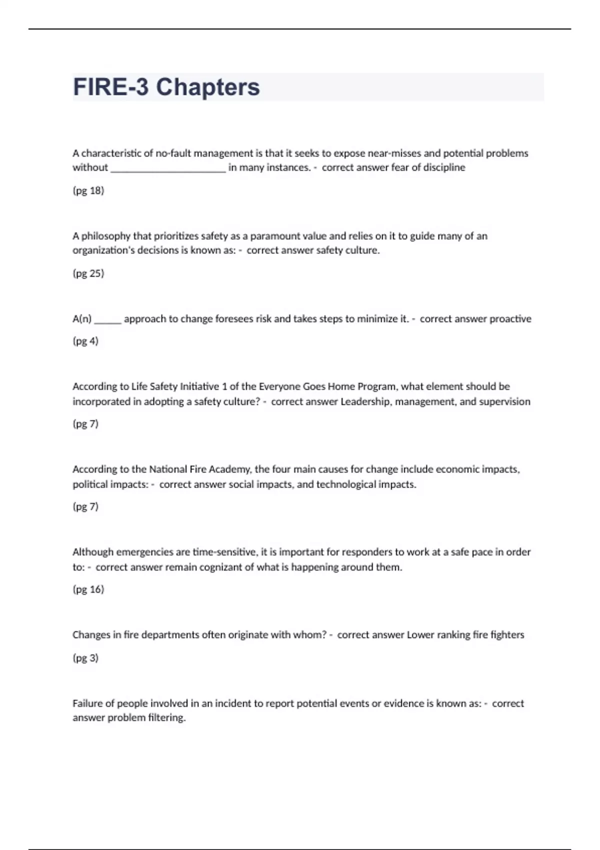 FIRE-3 Chapters Practice Exam Questions 2024. A characteristic of no-fault management is that it seeks to expose near-misses and potential problems without _____________________ in many instances. - correct answer fear of discipline (pg 18) A philosophy that prioritizes safety as a paramount value and relies on it to guide many of an organization's decisions is known as: - correct answer safety culture. (pg 25) A(n) _____ approach to change foresees risk and takes steps to minimize it. - correct answer proactive (pg 4) According to Life Safety Initiative 1 of the Everyone Goes Home Program, what element should be incorporated in adopting a safety culture? - correct answer Leadership, management, and supervision (pg 7) According to the National Fire Academy, the four main causes for change include economic impacts, political impacts: - correct answer social impacts, and technological impacts. (pg 7) Although emergencies are time-sensitive, it is important for responders to work at a safe pace in order to: - correct answer remain cognizant of what is happening around them. (pg 16) Changes in fire departments often originate with whom? - correct answer Lower ranking fire fighters (pg 3) Failure of people involved in an incident to report potential events or evidence is known as: - correct answer problem filtering. (pg 20) In order to accomplish a proactive safety initiative, the fire service must continually evaluate _____________ for emergencies while eliminating nonemergency mistakes. - correct answer standard procedures (pg 5) In order to create a safer working environment, the fire service's primary goal should be to: - correct answer forecast what could happen. (pg 5)