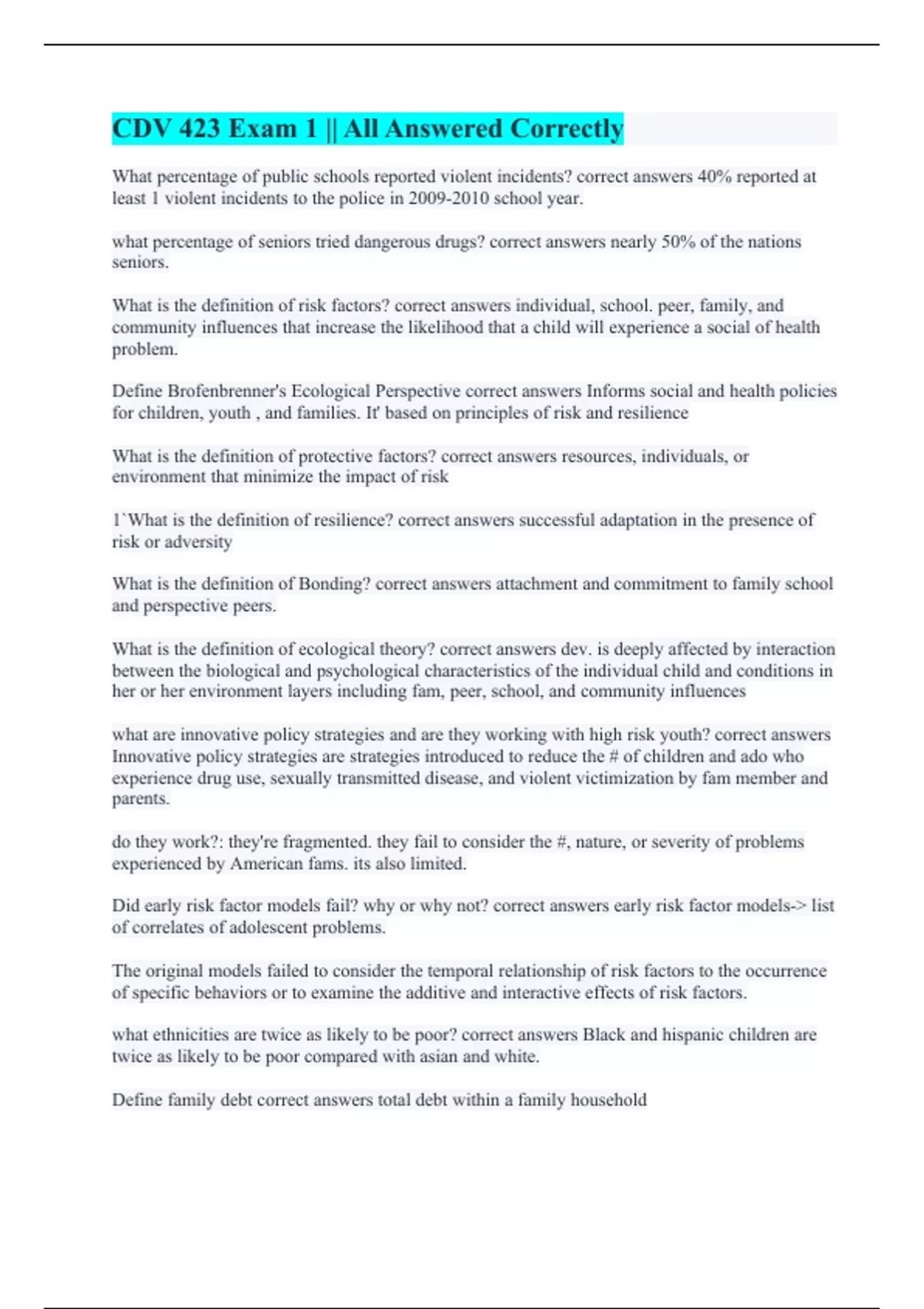 What percentage of public schools reported violent incidents? correct answers 40% reported at least 1 violent incidents to the police in school year. what percentage of seniors tried dangerous drugs? correct answers nearly 50% of the nations seniors. What is the definition of risk factors? correct answers individual, school. peer, family, and community influences that increase the likelihood that a child will experience a social of health problem. Define Brofenbrenner's Ecological Perspective correct answers Informs social and health policies for children, youth , and families. It' based on principles of risk and resilience What is the definition of protective factors? correct answers resources, individuals, or environment that minimize the impact of risk 1`What is the definition of resilience? correct answers successful adaptation in the presence of risk or adversity What is the definition of Bonding? correct answers attachment and commitment to family school and perspective peers. What is the definition of ecological theory? correct answers dev. is deeply affected by interaction between the biological and psychological characteristics of the individual child and conditions in her or her environment layers including fam, peer, school, and community influences what are innovative policy strategies and are they working with high risk youth? correct answers Innovative policy strategies are strategies introduced to reduce the # of children and ado who experience drug use, sexually transmitted disease, and violent victimization by fam member and parents. do they work?: they're fragmented. they fail to consider the #, nature, or severity of problems experienced by American fams. its also limited. Did early risk factor models fail? why or why not? correct answers early risk factor models- list of correlates of adolescent problems. The original models failed to consider the temporal relationship of risk factors to the occurrence of specific behaviors or to examine the additive and interactive effects of risk factors. what ethnicities are twice as likely to be poor? correct answers Black and hispanic children are twice as likely to be poor compared with asian and white. Define family debt correct answers total debt within a family household