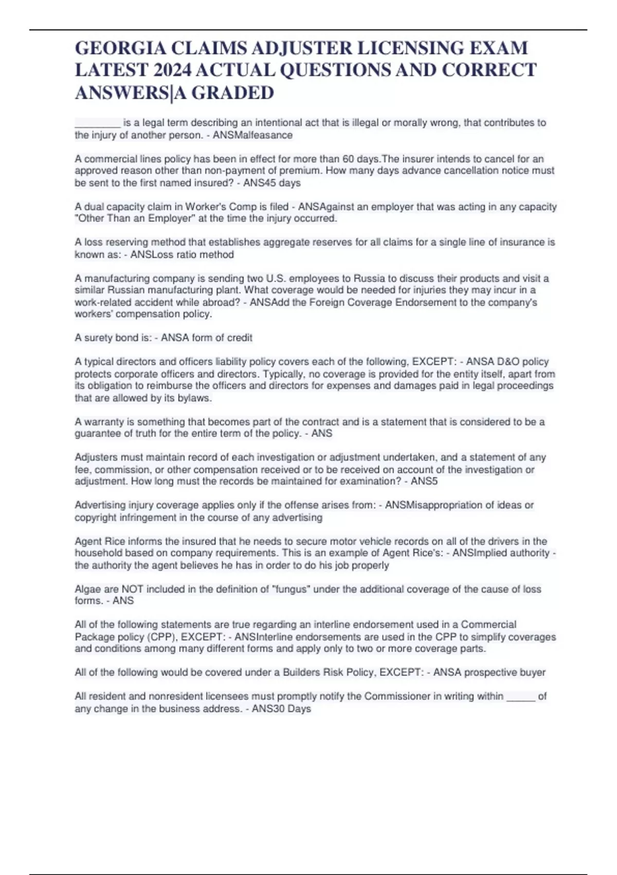 GEORGIA CLAIMS ADJUSTER LICENSING EXAM LATEST 2024 ACTUAL QUESTIONS AND CORRECT ANSWERS|A GRADED