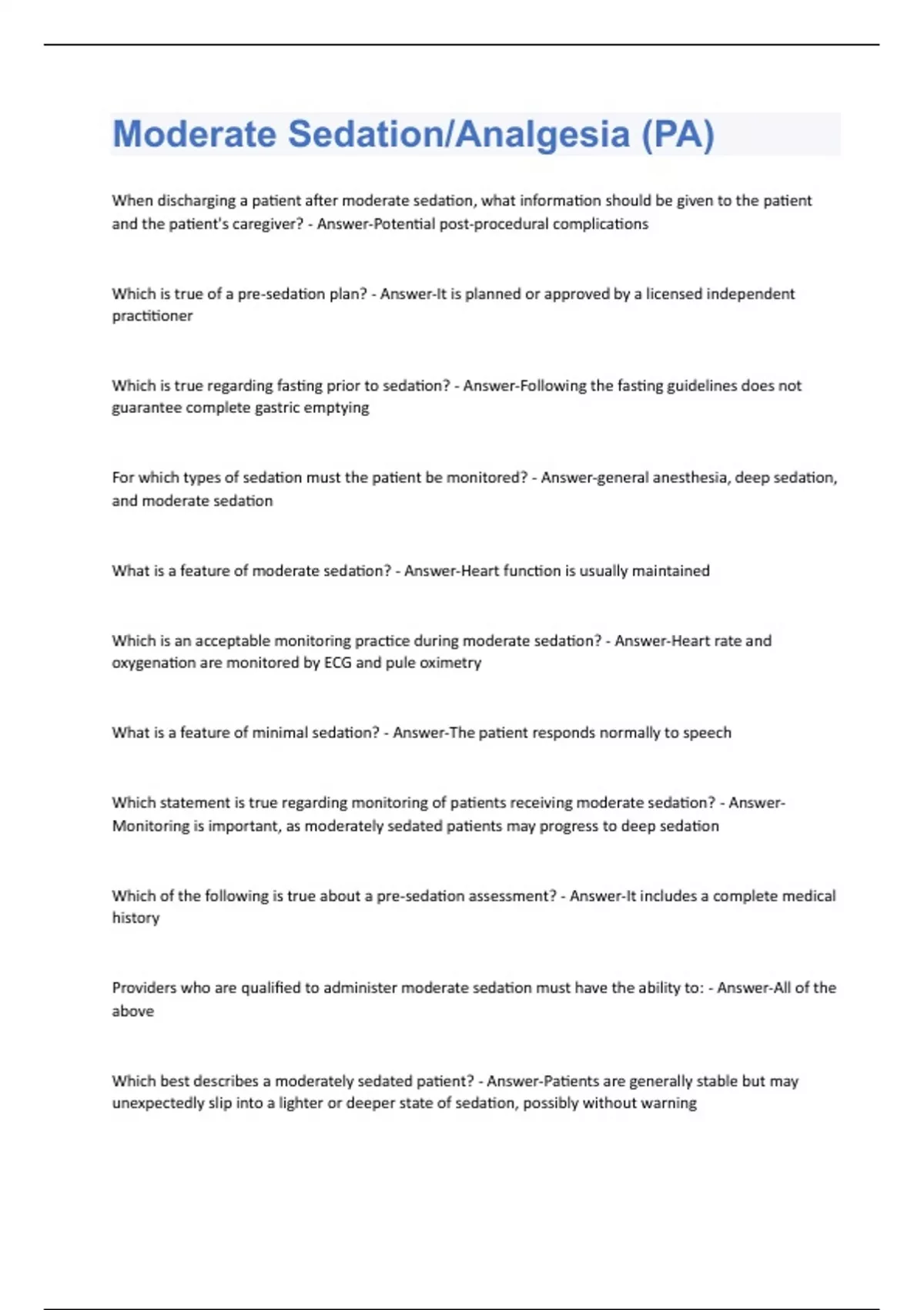 Moderate Sedation/Analgesia (PA) Questions and Answers 2024 Correctly done