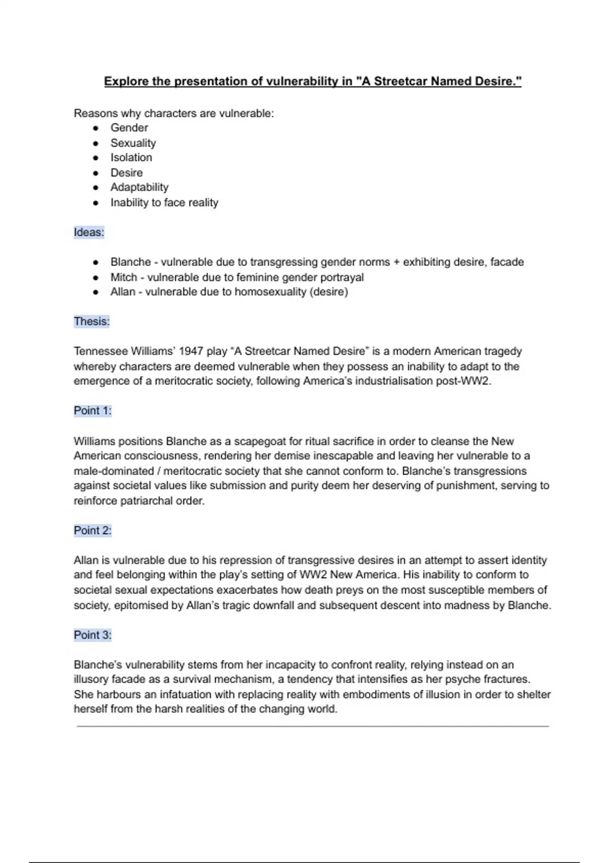 ● Blanche - vulnerable due to transgressing gender norms + exhibiting desire, facade