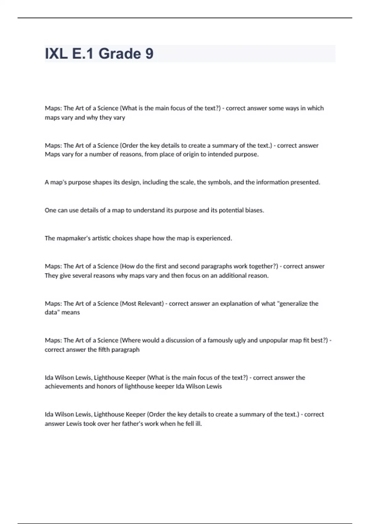IXL E.1 Grade 9 Correctly Answered Test 2024. Maps: The Art of a Science (What is the main focus of the text?) - correct answer some ways in which maps vary and why they vary Maps: The Art of a Science (Order the key details to create a summary of the text.) - correct answer Maps vary for a number of reasons, from place of origin to intended purpose. A map's purpose shapes its design, including the scale, the symbols, and the information presented. One can use details of a map to understand its purpose and its potential biases. The mapmaker's artistic choices shape how the map is experienced. Maps: The Art of a Science (How do the first and second paragraphs work together?) - correct answer They give several reasons why maps vary and then focus on an additional reason. Maps: The Art of a Science (Most Relevant) - correct answer an explanation of what "generalize the data" means Maps: The Art of a Science (Where would a discussion of a famously ugly and unpopular map fit best?) - correct answer the fifth paragraph Ida Wilson Lewis, Lighthouse Keeper (What is the main focus of the text?) - correct answer the achievements and honors of lighthouse keeper Ida Wilson Lewis Ida Wilson Lewis, Lighthouse Keeper (Order the key details to create a summary of the text.) - correct answer Lewis took over her father's work when he fell ill.
