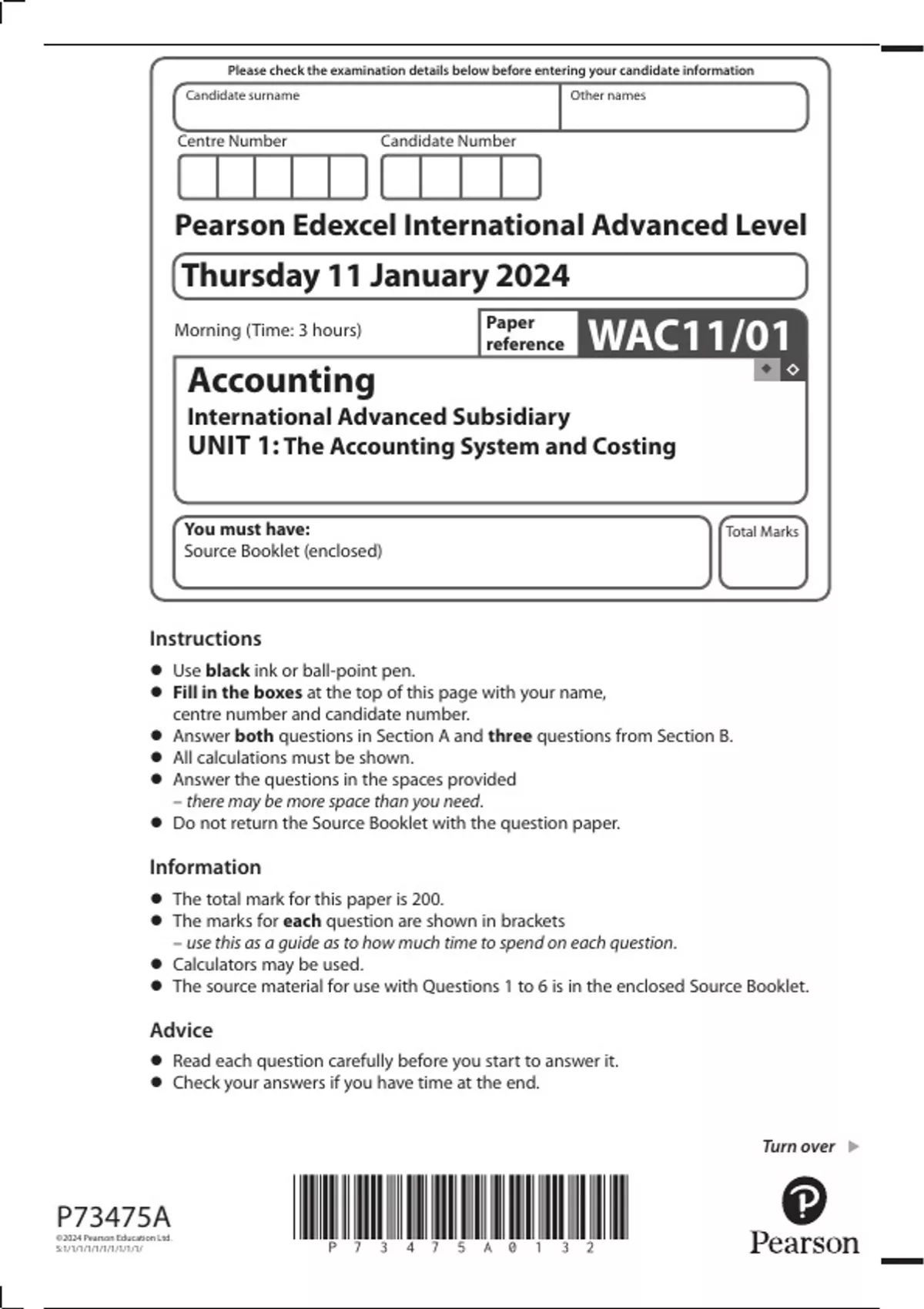 Pearson Edexcel A-Level Accounting Advanced Subsidiary UNIT 1: The Accounting System and Costing January 2024 Authentic Marking Scheme Attached