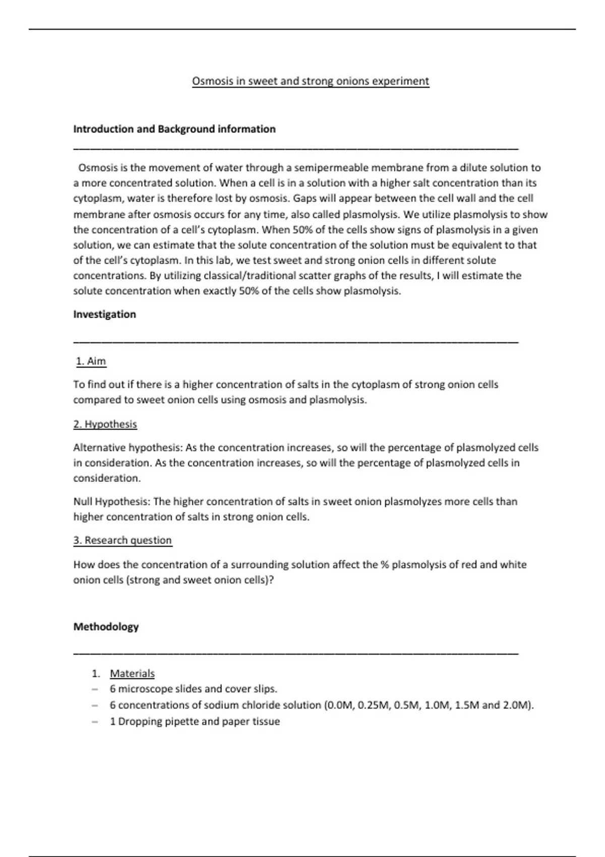 Null Hypothesis: The higher concentration of salts in sweet onion plasmolyzes more cells than
