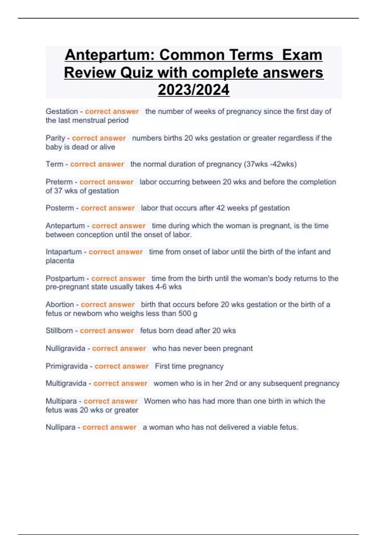 Antepartum: Common Terms Exam Review Quiz with complete answers 2023/2024