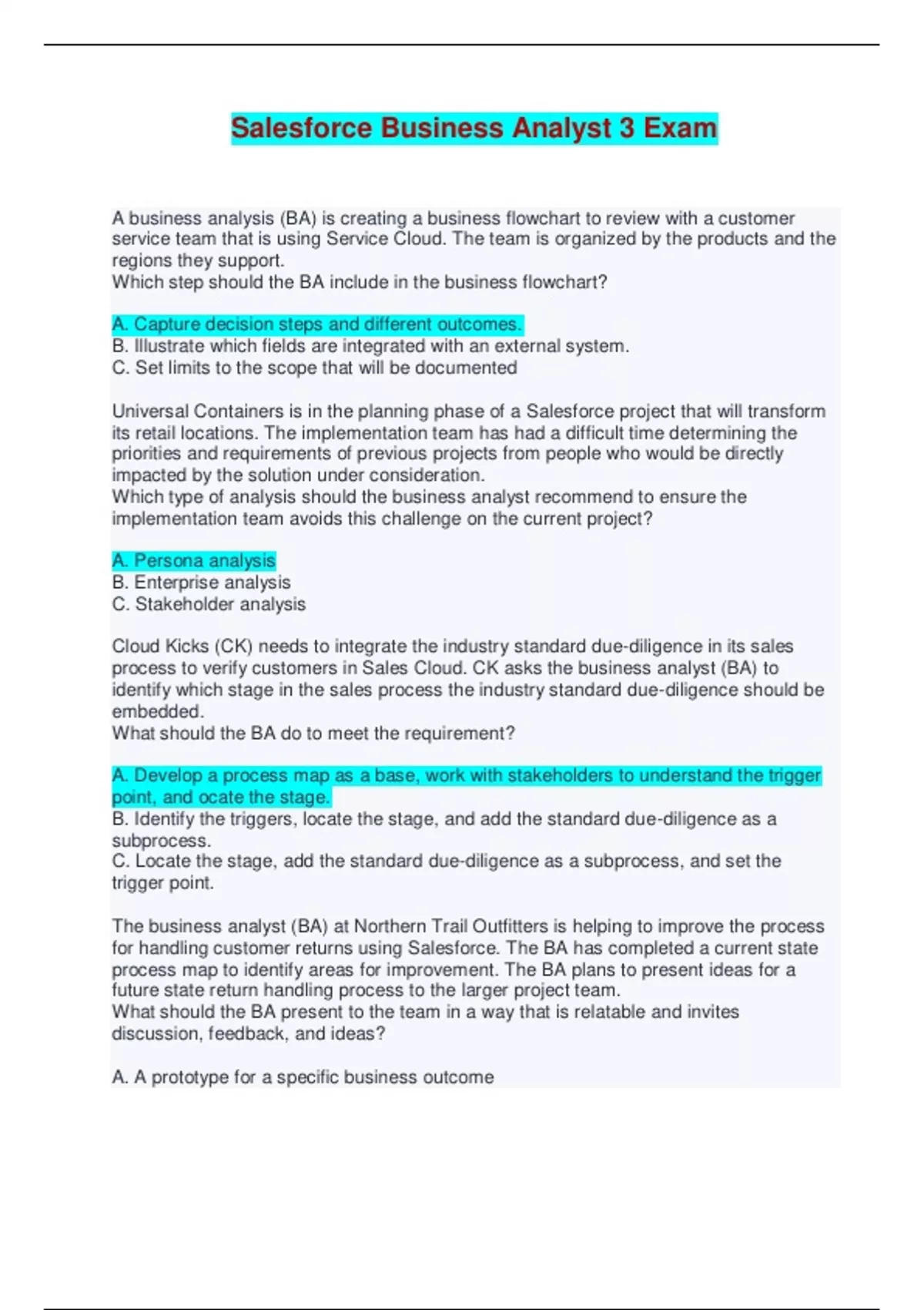 Salesforce Business Analyst 3 Exam - Questions with 100% Correct Answers A business analysis (BA) is creating a business flowchart to review with a customer service team that is using Service Cloud. The team is organized by the products and the regions they support. Which step should the BA include in the business flowchart? A. Capture decision steps and different outcomes. B. Illustrate which fields are integrated with an external system. C. Set limits to the scope that will be documented Universal Containers is in the planning phase of a Salesforce project that will transform its retail locations. The implementation team has had a difficult time determining the priorities and requirements of previous projects from people who would be directly impacted by the solution under consideration. Which type of analysis should the business analyst recommend to ensure the implementation team avoids this challenge on the current project? A. Persona analysis B. Enterprise analysis C. Stakeholder analysis Cloud Kicks (CK) needs to integrate the industry standard due-diligence in its sales process to verify customers in Sales Cloud. CK asks the business analyst (BA) to identify which stage in the sales process the industry standard due-diligence should be embedded. What should the BA do to meet the requirement? A. Develop a process map as a base, work with stakeholders to understand the trigger point, and ocate the stage. B. Identify the triggers, locate the stage, and add the standard due-diligence as a subprocess. C. Locate the stage, add the standard due-diligence as a subprocess, and set the trigger point. The business analyst (BA) at Northern Trail Outfitters is helping to improve the process for handling customer returns using Salesforce. The BA has completed a current state process map to identify areas for improvement. The BA plans to present ideas for a future state return handling process to the larger project team. What should the BA present to the team in a way that is relatable and invites discussion, feedback, and ideas? A. A prototype for a specific business outcome B. Detailed technical documentation with annotations C. A story using personas to illustrate potential solutions Northern Trail Outfitters is implementing Marketing Cloud. Stakeholders are having a difficult time conceptualizing how Marketing Cloud uses insights to create journeys. The Business analyst (BA) has been asked to show stakeholders how it works so the implementation project can move forward. Timelines are two tight to present a demo, and approval from stakeholders is needed soon in order to keep the project on track. What should the BA do to help stakeholders visualize how it will work? A. Create a UPN (Universal Process Notation) diagram. B. Build a capability model. C. Schedule a storyboarding session. Universal Containers is focused on an initiative to streamline its channel management processes. Due to the level of complexity, the business analyst (BA) will gather and document the key points in preparation to build a more detailed process map. Which diagram should the BA use in this case? A. SIPOC (Suppliers, Inputs, Process, Outputs, Customers) B. Capability Model C. Value Stream Map Universal Containers is implementing a Salesforce solution that's designed to transform its customer service division. During sprint planning, it was determined that the development team would be able to successfully deliver all remaining work items. However, due to unplanned delays, the development team is now at risk of being unable to complete the work items. The project manager has asked for the business analyst's (BA) help to prioritize the remaining work items. The development team has 16 hours of capacity remaining and is focused on launching a minimum viable product (MVP) of the customer service solution as soon as possible. Which work items should the BA prioritize with the remaining 16 hours of development capacity? A. US-4008 and US-4009 B. US-4007 and US-4009 C. US-4009 and US-4010 Northern Trail Outfitters follows an Agile methodology for its Marketing Cloud projects. The project team creates several types of documents. Which document should a business analyst use to .capture the software and behavioral requirements of the application? A. Scope statement specification B. Functional requirements specification C. System requirements specification The business analyst at Cloud Kicks is beginning to write user stories for its Salesforce implementation. Which three components should-be included when writing a user story? A. Who, what, why B. When, where, why C. Who, when, why Cloud Kicks is planning to create a new Service Cloud console app for its services team to resolve issues with delayed shipments to customers. The business analyst (BA) wrote the user stories based on a written list of requirements provided by the manager of the services team. Upon stakeholder review with the entire services team, many of the user stories were rejected and the BA had to revise them. When the BA wrote the initial user stories, what was the likely cause of the issue? A. The user stories focused on well-defined personas. B. The project team failed to discuss the user stories as a group. C. The acceptance criteria of the user stories were too specific. New interns at Universal Containers have been tasked with following a new process to import leads from a spreadsheet into Salesforce. A business analyst is mapping the process to document the overall lead creation process. What should the process map look like? A. A very detailed process map that is unambiguous and version controlled B. A somewhat detailed process map that is easy to remember and self- explanatory C. A simple process map that is high-level and covers key aspects Universal Containers is developing a new case management solution in Salesforce. The business analyst has started writing user stories to capture feature needs. One user story is: The customer care representative 