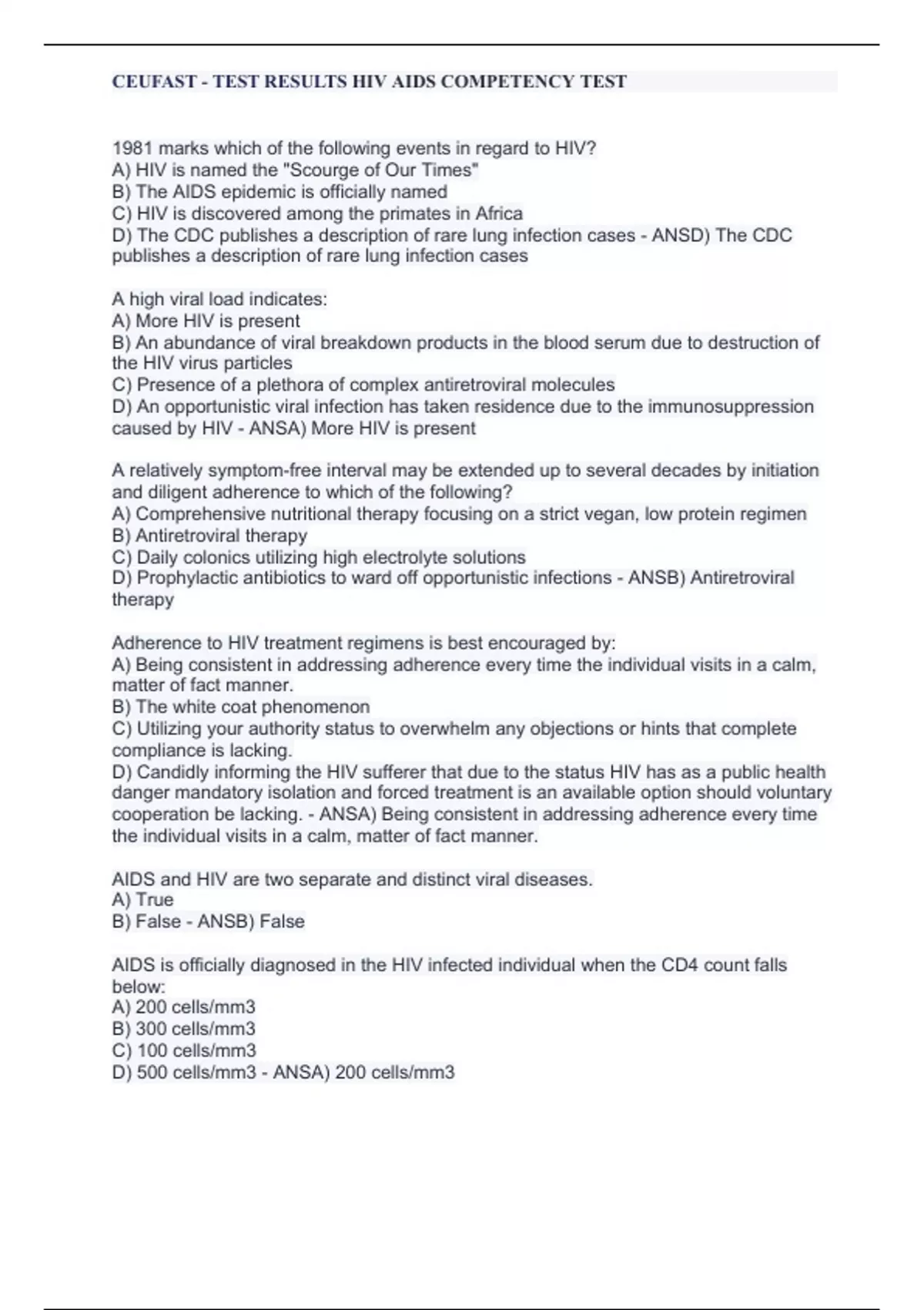 ,CEUFAST - TEST RESULTS HIV AIDS COMPETENCY TEST