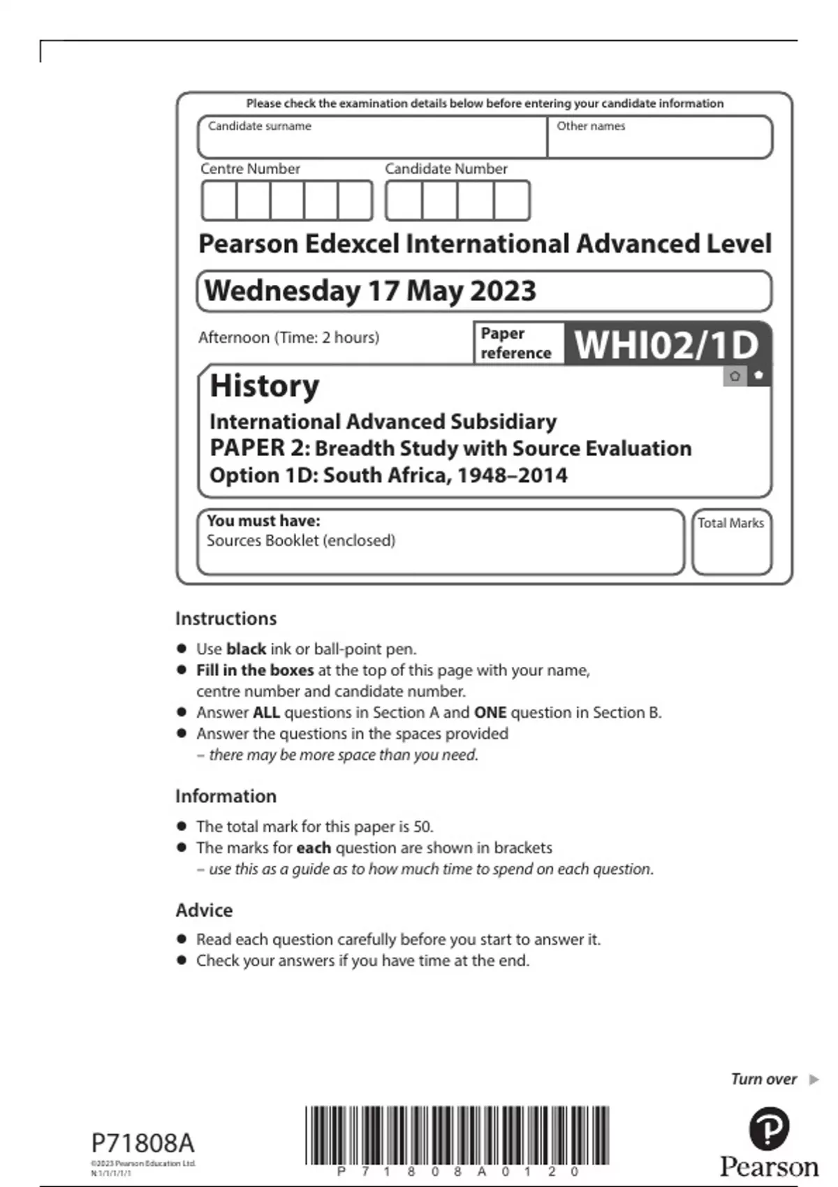 Pearson Edexcel A-Level History Advanced Subsidiary PAPER 2: Breadth Study with Source Evaluation Option 1D: South Africa, 1948–2014 January 2024 Authentic Marking Scheme Attached