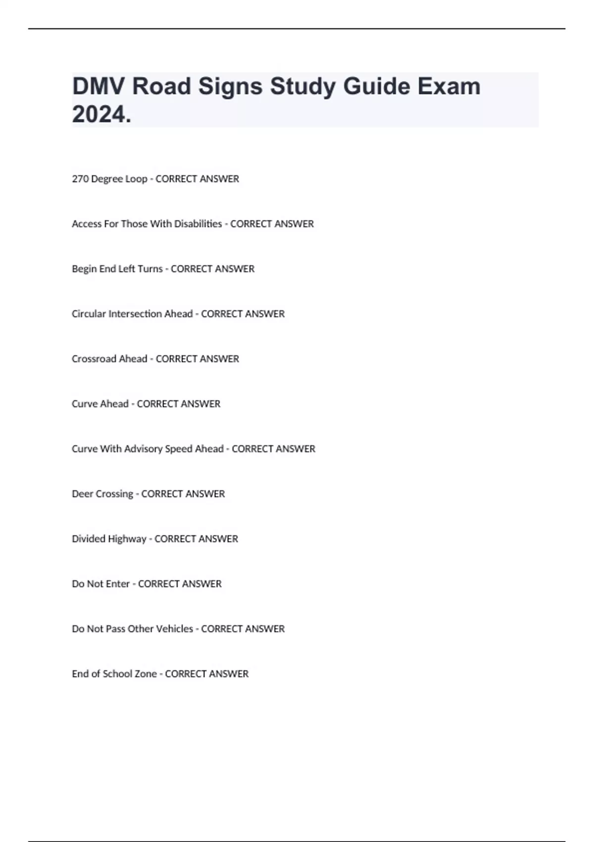 DMV Road Signs Study Guide Exam 2024. 270 Degree Loop - CORRECT ANSWER Access For Those With Disabilities - CORRECT ANSWER Begin End Left Turns - CORRECT ANSWER Circular Intersection Ahead - CORRECT ANSWER Crossroad Ahead - CORRECT ANSWER Curve Ahead - CORRECT ANSWER Curve With Advisory Speed Ahead - CORRECT ANSWER Deer Crossing - CORRECT ANSWER Divided Highway - CORRECT ANSWER Do Not Enter - CORRECT ANSWER Do Not Pass Other Vehicles - CORRECT ANSWER End of School Zone - CORRECT ANSWER