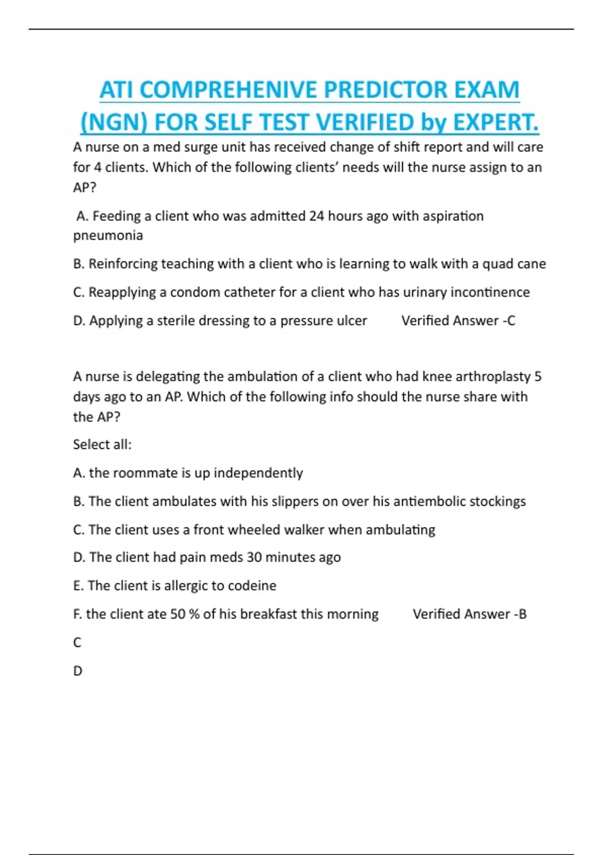 ATI COMPREHENIVE PREDICTOR EXAM (NGN) FOR SELF TEST VERIFIED by EXPERT.