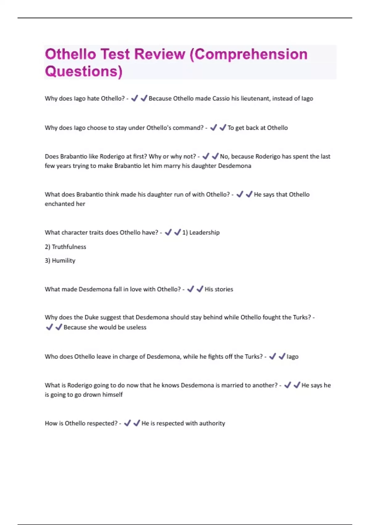 Othello Test Review (Comprehension Questions) Graded A+