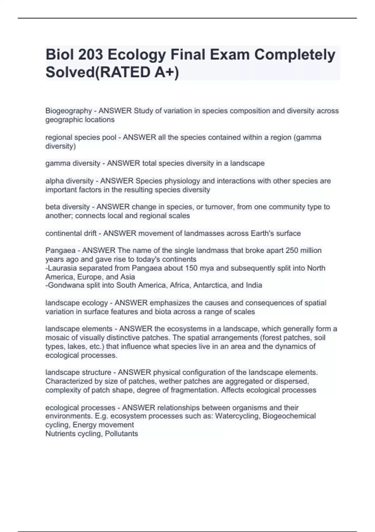 Biogeography - ANSWER Study of variation in species composition and diversity across geographic locations regional species pool - ANSWER all the species contained within a region (gamma diversity) gamma diversity - ANSWER total species diversity in a landscape alpha diversity - ANSWER Species physiology and interactions with other species are important factors in the resulting species diversity beta diversity - ANSWER change in species, or turnover, from one community type to another; connects local and regional scales continental drift - ANSWER movement of landmasses across Earth's surface Pangaea - ANSWER The name of the single landmass that broke apart 250 million years ago and gave rise to today's continents -Laurasia separated from Pangaea about 150 mya and subsequently split into North America, Europe, and Asia -Gondwana split into South America, Africa, Antarctica, and India landscape ecology - ANSWER emphasizes the causes and consequences of spatial variation in surface features and biota across a range of scales landscape elements - ANSWER the ecosystems in a landscape, which generally form a mosaic of visually distinctive patches. The spatial arrangements (forest patches, soil types, lakes, etc.) that influence what species live in an area and the dynamics of ecological processes. landscape structure - ANSWER physical configuration of the landscape elements. Characterized by size of patches, wether patches are aggregated or dispersed, complexity of patch shape, degree of fragmentation. Affects ecological processes ecological processes - ANSWER relationships between organisms and their environments. E.g. ecosystem processes such as: Watercycling, Biogeochemical cycling, Energy movement Nutrients cycling, Pollutants habitat heterogeneity - ANSWER Describes a habitat or community that has a complex physiognomy or structure, including in the distribution, density, and relative heights of plants within it. legacy effects - ANSWER a long-lasting influence of historical processes on the current ecology of an area edge effects - ANSWER Changes in population or community structures that occur at the boundary of two or more habitats