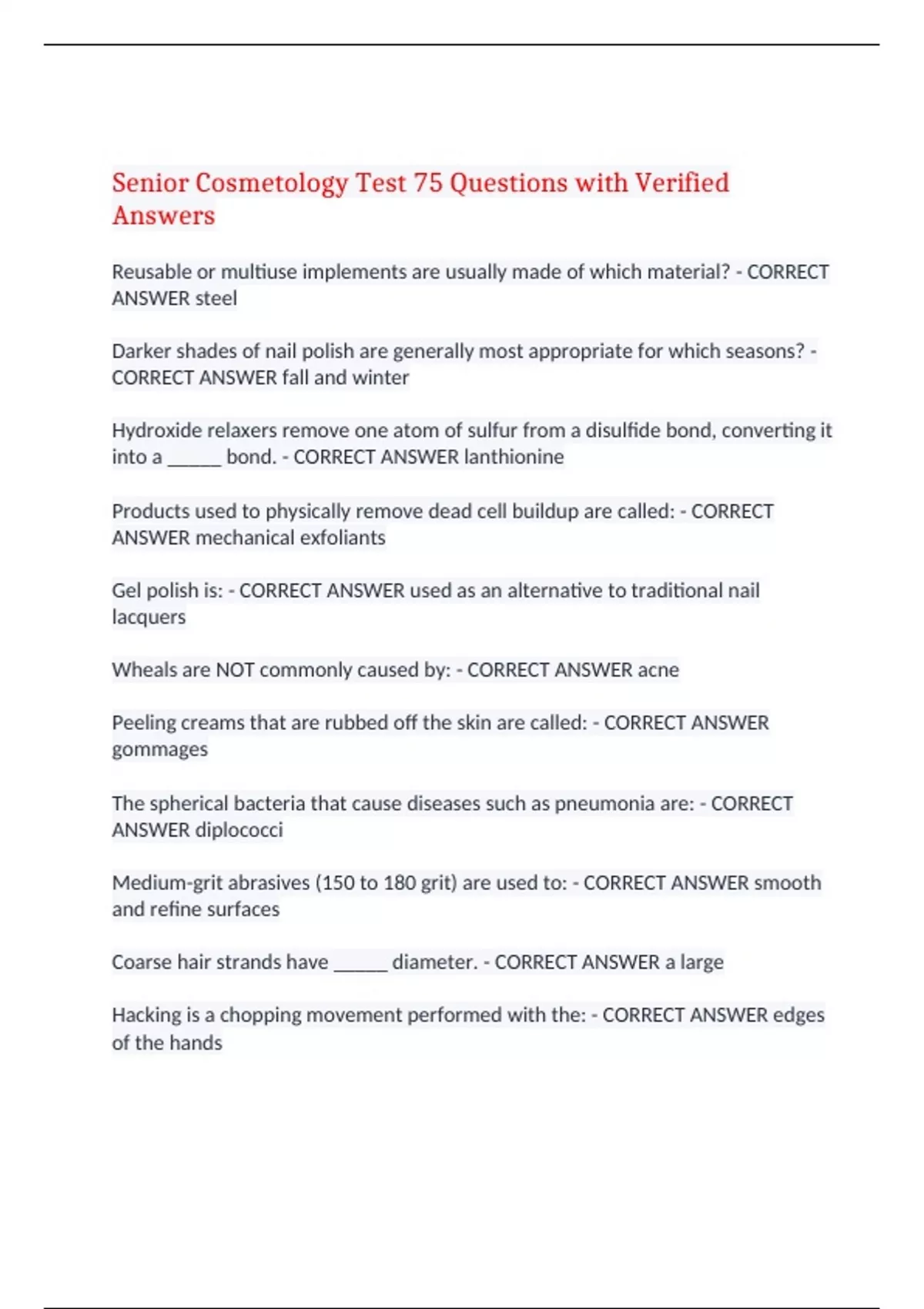 Senior Cosmetology Test 75 Questions with Verified Answers,100% CORRECT