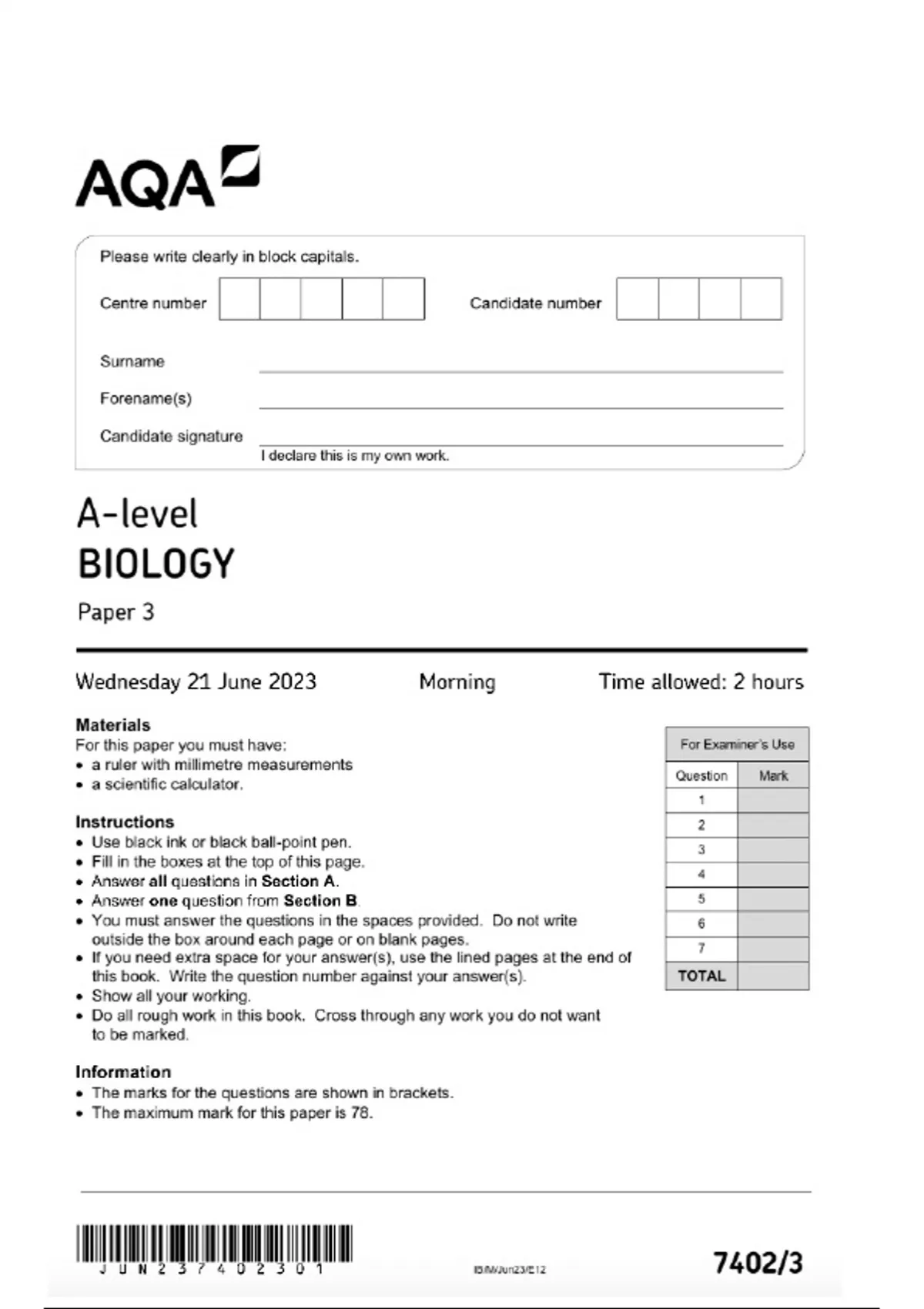 This is the official aqa official biology a level paper 3 2023 paper which is unreleased and will be used for your mocks and future exams.