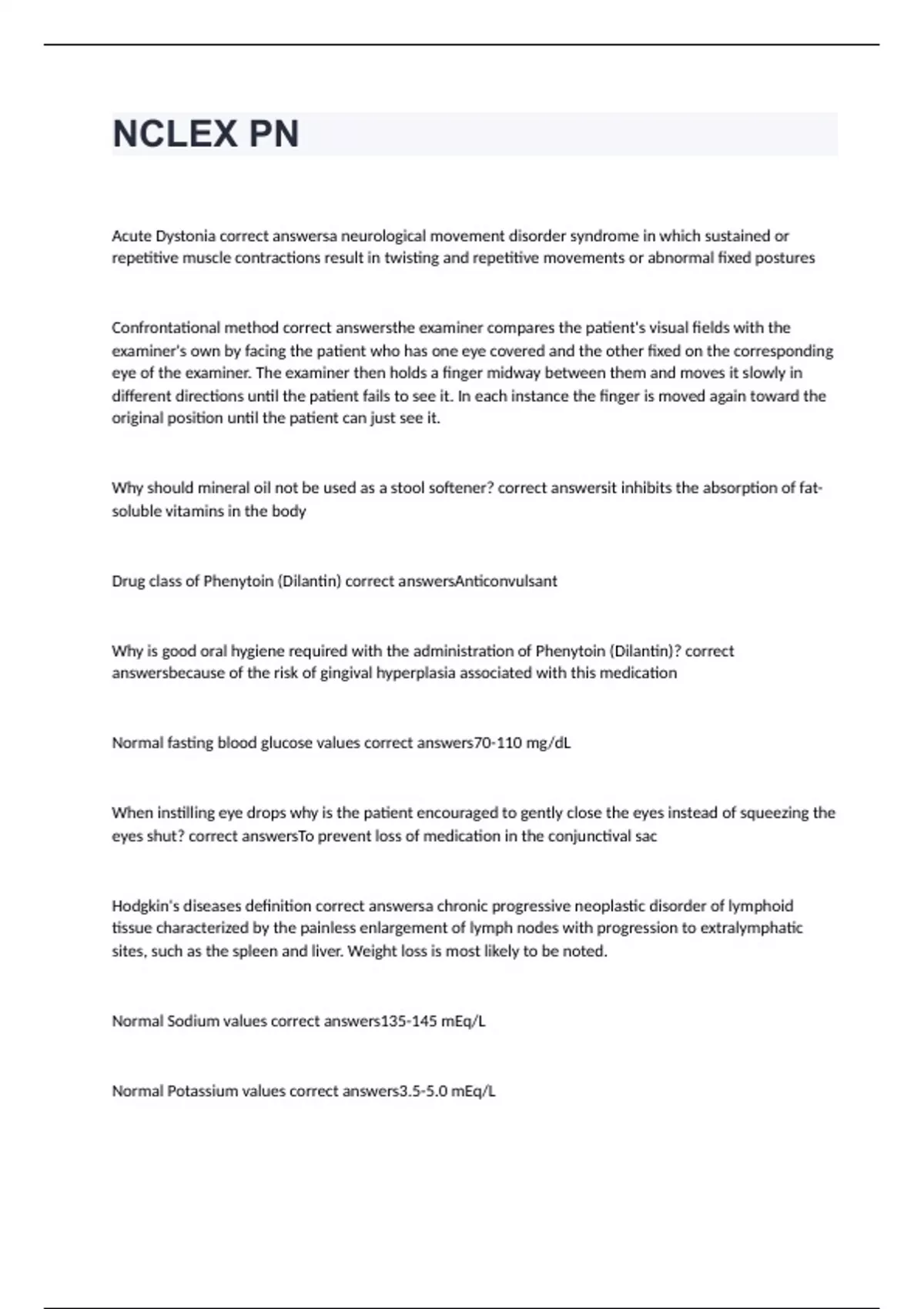Acute Dystonia correct answersa neurological movement disorder syndrome in which sustained or repetitive muscle contractions result in twisting and repetitive movements or abnormal fixed postures Confrontational method correct answersthe examiner compares the patient's visual fields with the examiner's own by facing the patient who has one eye covered and the other fixed on the corresponding eye of the examiner. The examiner then holds a finger midway between them and moves it slowly in different directions until the patient fails to see it. In each instance the finger is moved again toward the original position until the patient can just see it. Why should mineral oil not be used as a stool softener? correct answersit inhibits the absorption of fat-soluble vitamins in the body Drug class of Phenytoin (Dilantin) correct answersAnticonvulsant Why is good oral hygiene required with the administration of Phenytoin (Dilantin)? correct answersbecause of the risk of gingival hyperplasia associated with this medication Normal fasting blood glucose values correct answers70-110 mg/dL When instilling eye drops why is the patient encouraged to gently close the eyes instead of squeezing the eyes shut? correct answersTo prevent loss of medication in the conjunctival sac Hodgkin's diseases definition correct answersa chronic progressive neoplastic disorder of lymphoid tissue characterized by the painless enlargement of lymph nodes with progression to extralymphatic sites, such as the spleen and liver. Weight loss is most likely to be noted. Normal Sodium values correct answers135-145 mEq/L Normal Potassium values correct answers3.5-5.0 mEq/L